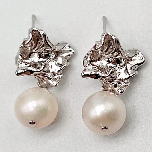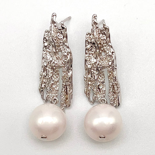 Retro Wind. White Edison Pearl earrings in Silver 925. Cliff Rock Texture