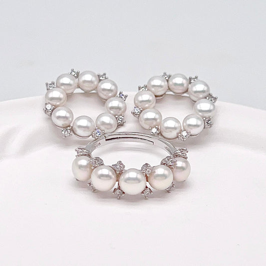 Retro Wind. Freshwater Pearl Earrings and Ring Set in silver 925. Round Spark 02
