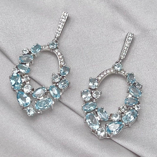 Blue Topaz Oval Cluster Drop Earrings Silver 925