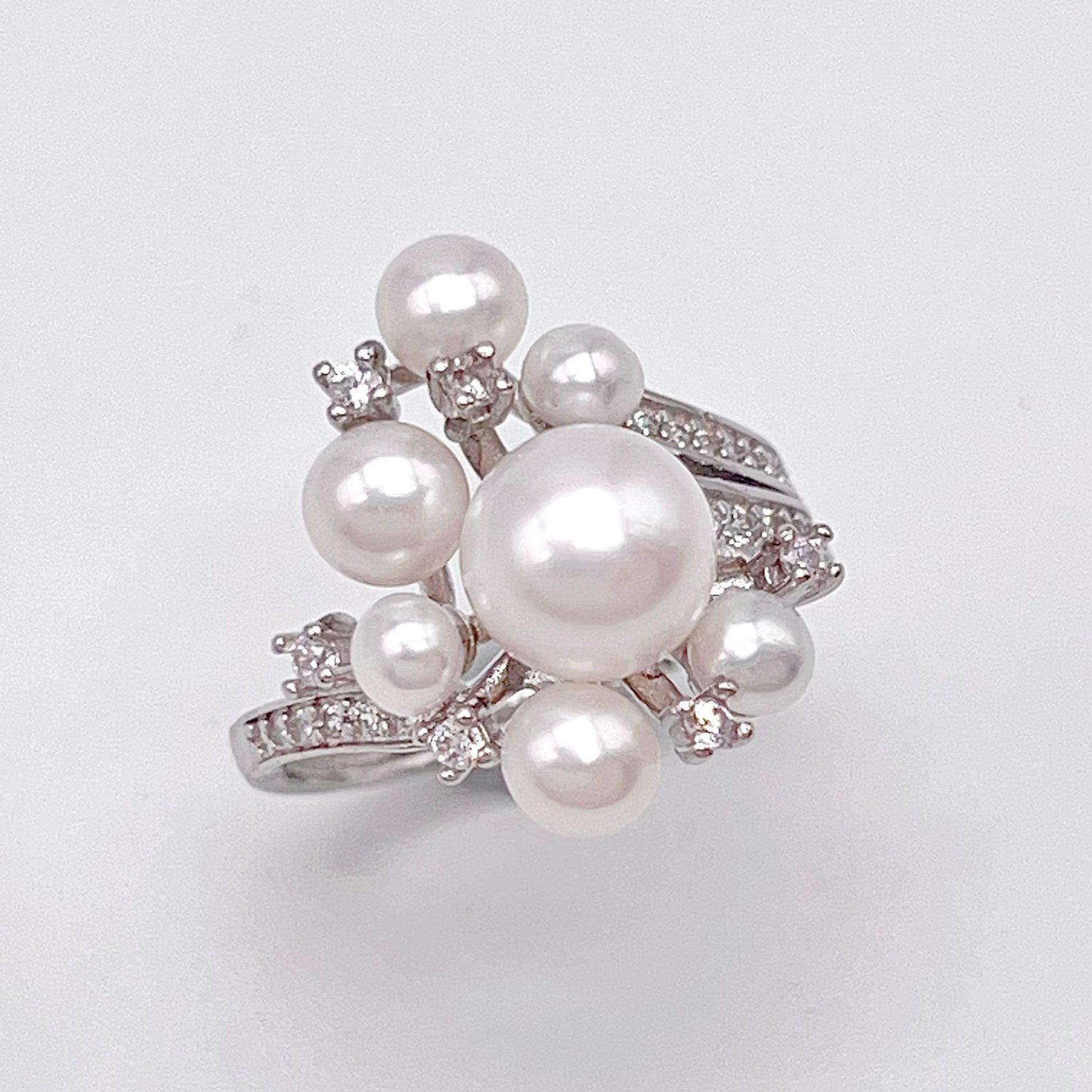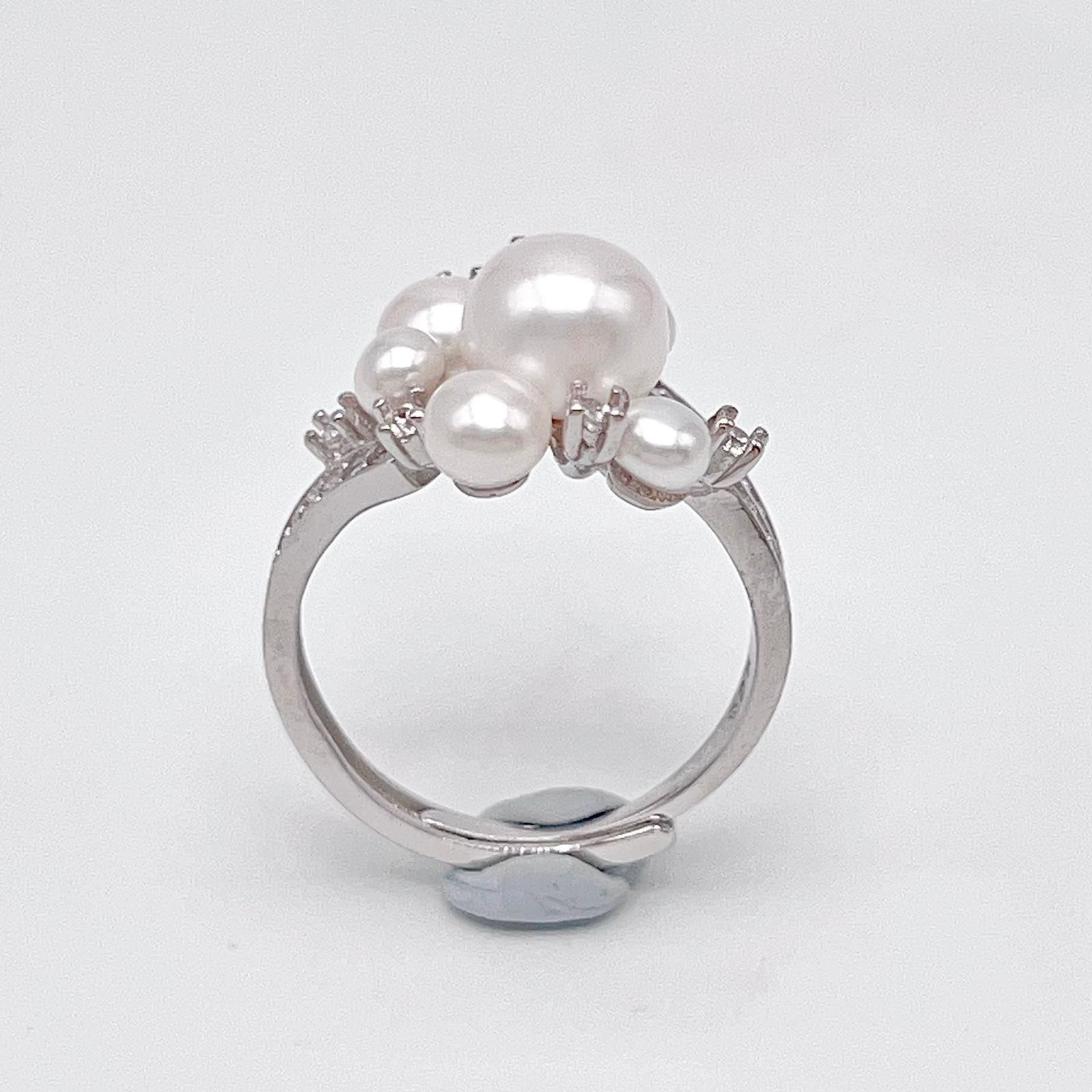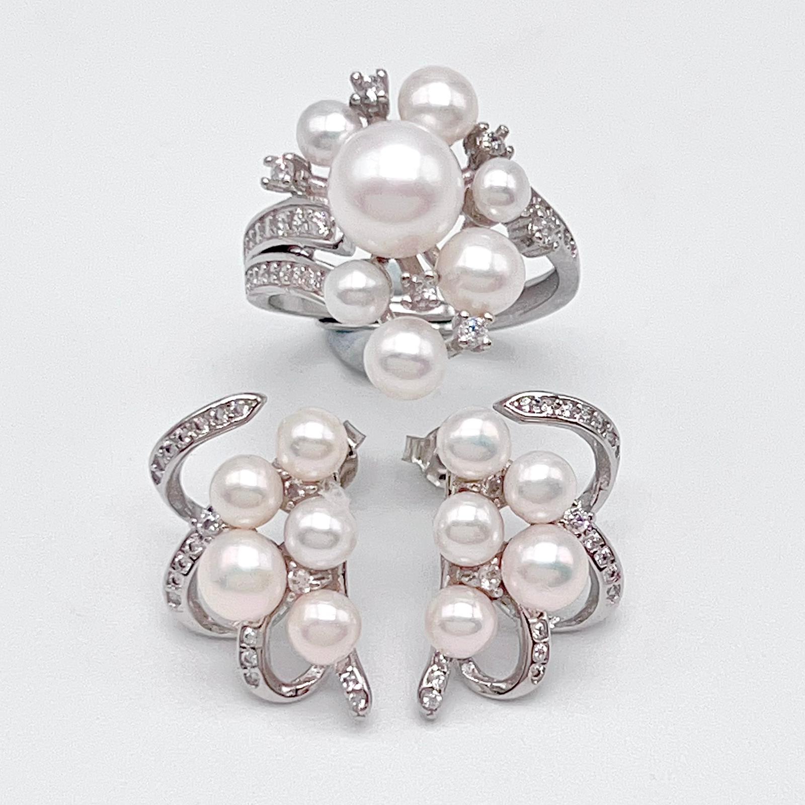 Antique Impression. Multi-pearl Ring and Earring Set in Silver 925. Ribbon & Snowball