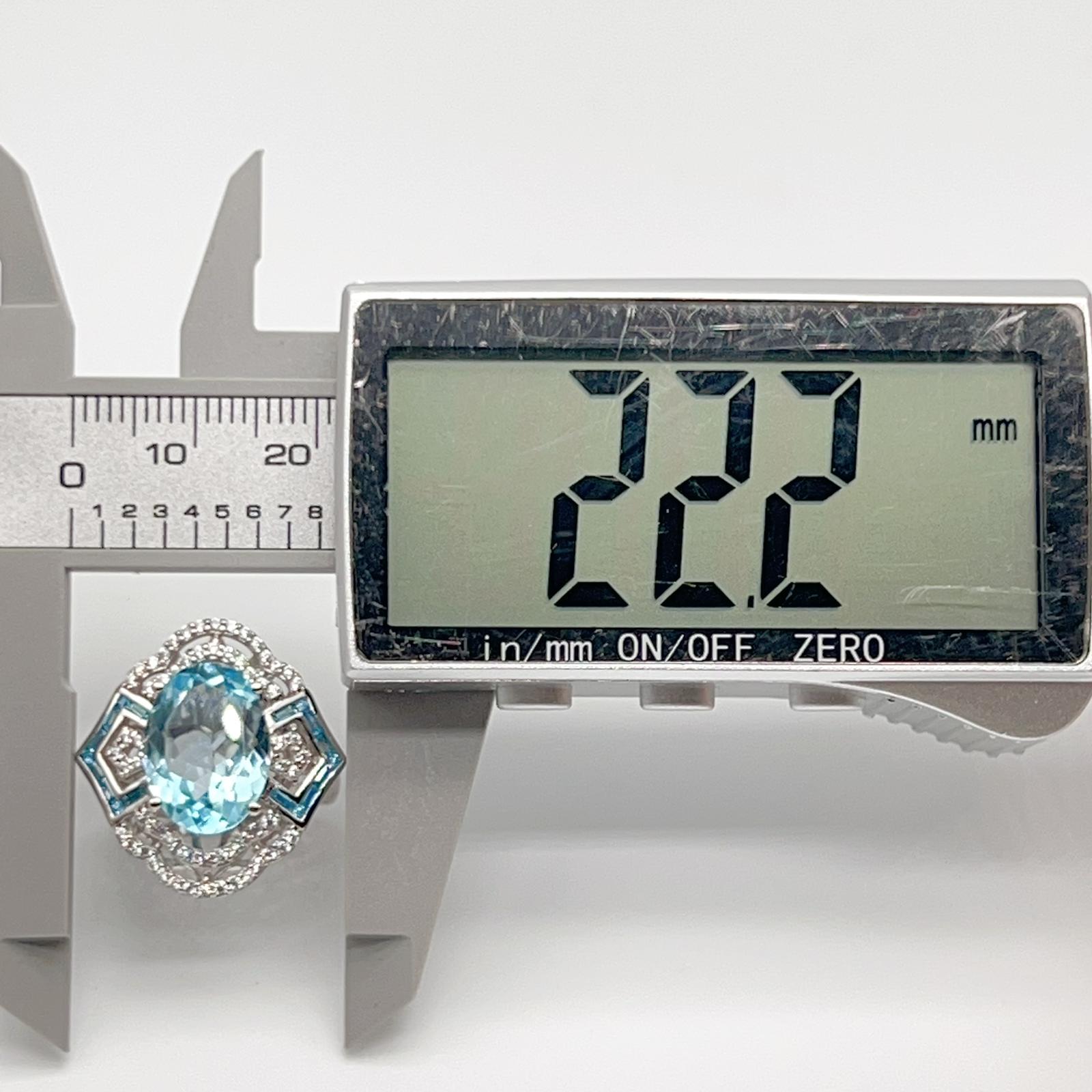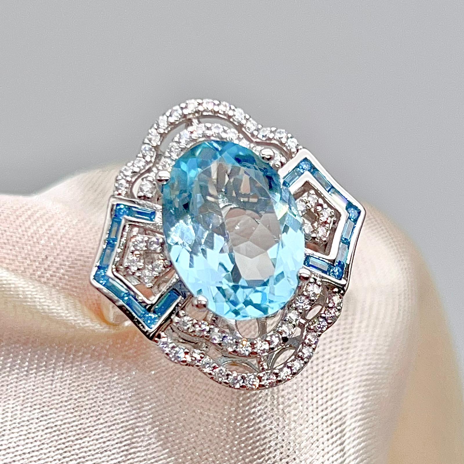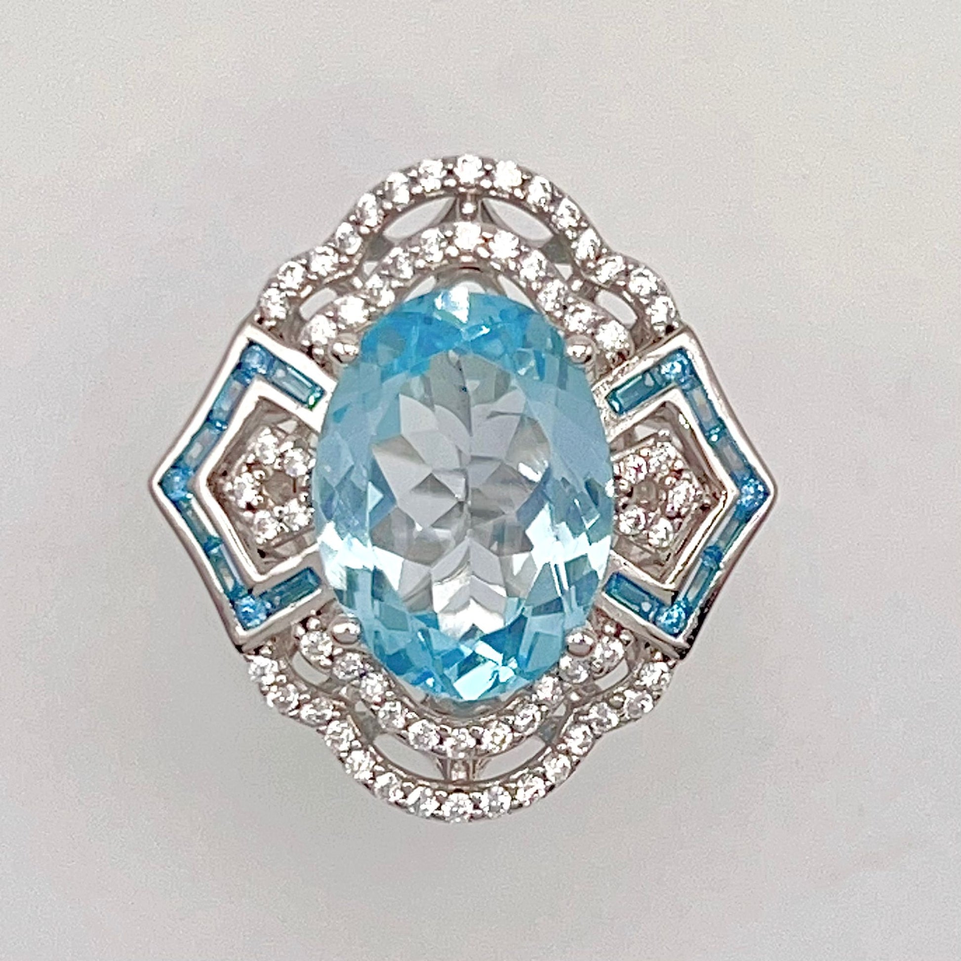 This bold ring showcases a large, brilliant oval blue topaz centerpiece, complemented by a sparkling halo of diamond accents. The intricate sterling silver setting features a stunning blend of swirling, pavé-set stones and modern geometric blue accents.