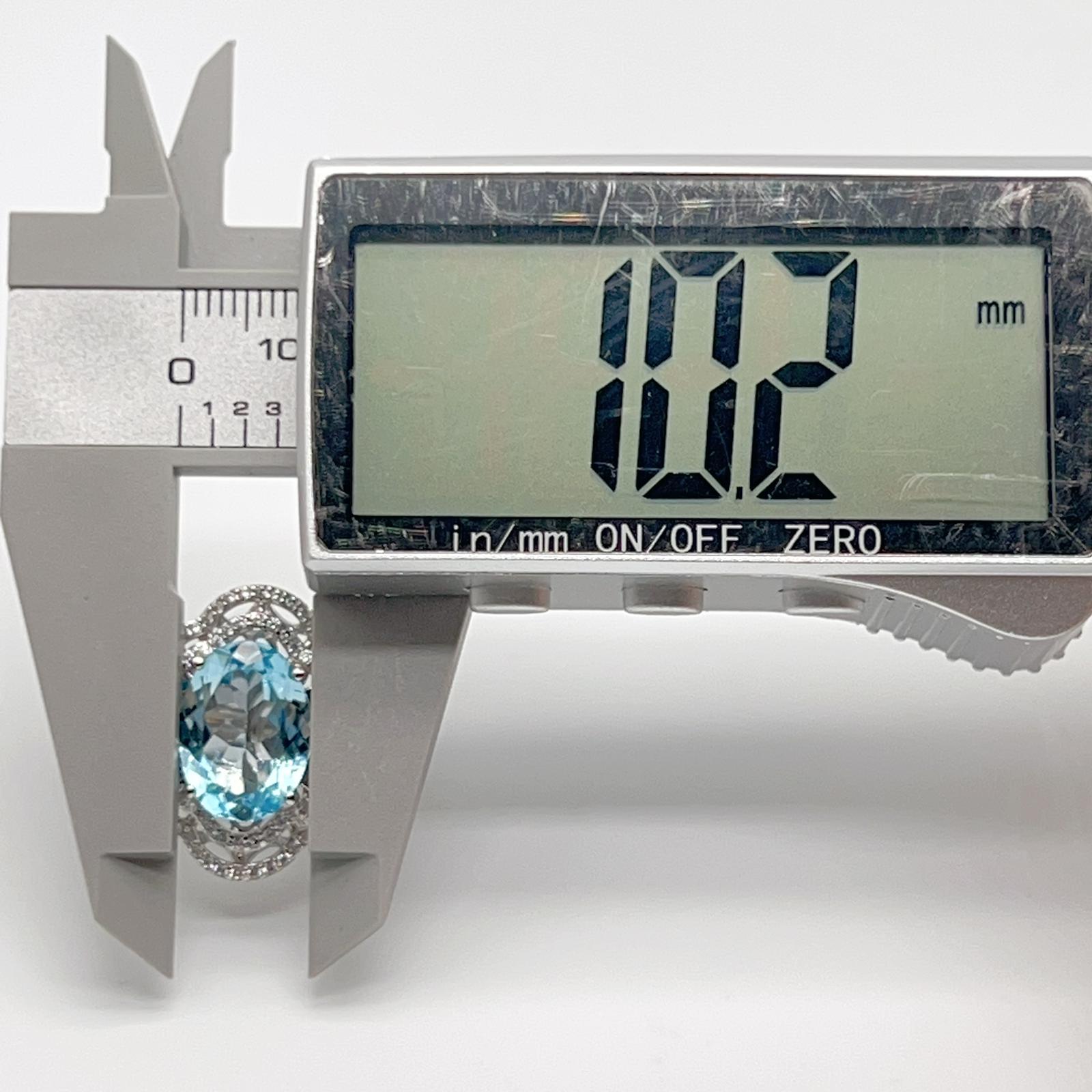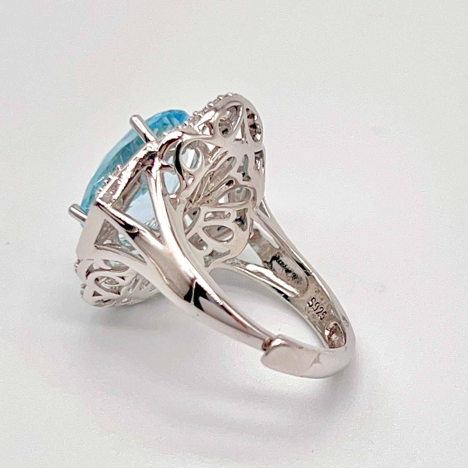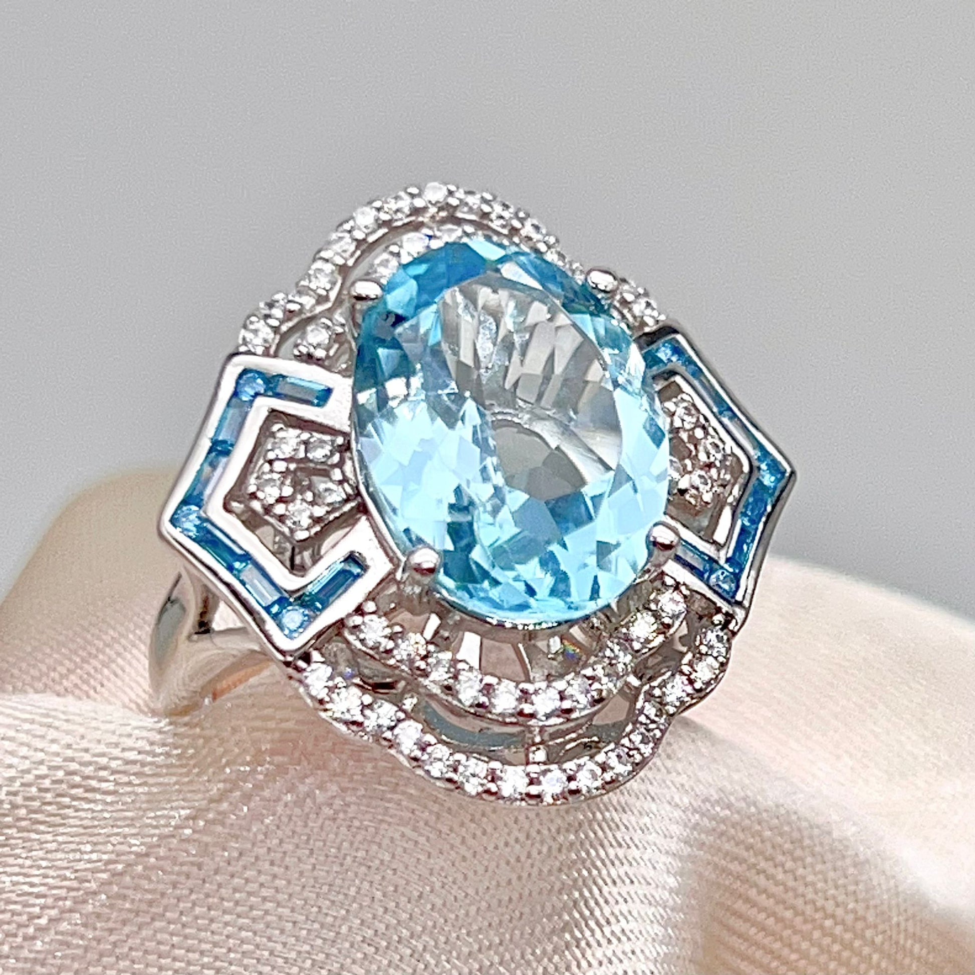 This bold ring showcases a large, brilliant oval blue topaz centerpiece, complemented by a sparkling halo of diamond accents. The intricate sterling silver setting features a stunning blend of swirling, pavé-set stones and modern geometric blue accents.
