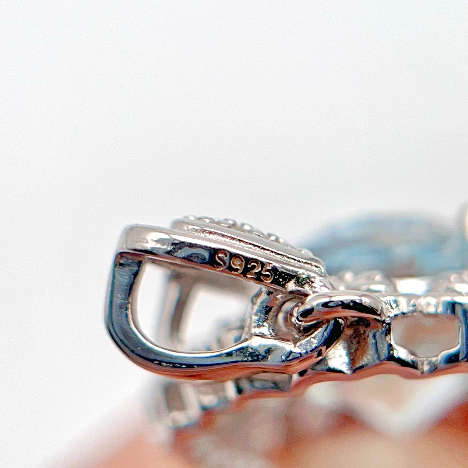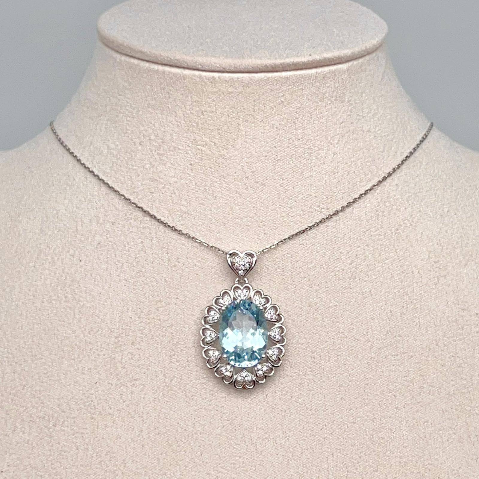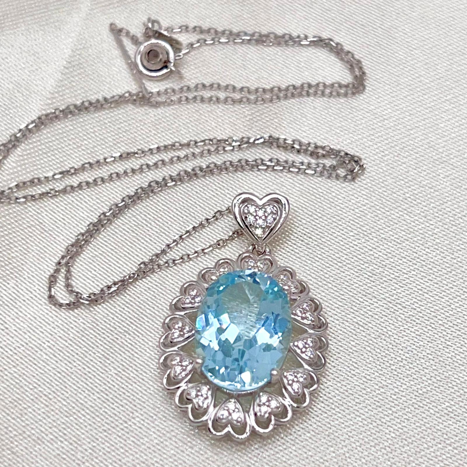 This beautiful necklace features a large, brilliant oval blue topaz surrounded by a romantic halo of small, diamond-accented heart clusters. Suspended from a delicate sterling silver chain, the pendant makes for a thoughtful and stunning gift.