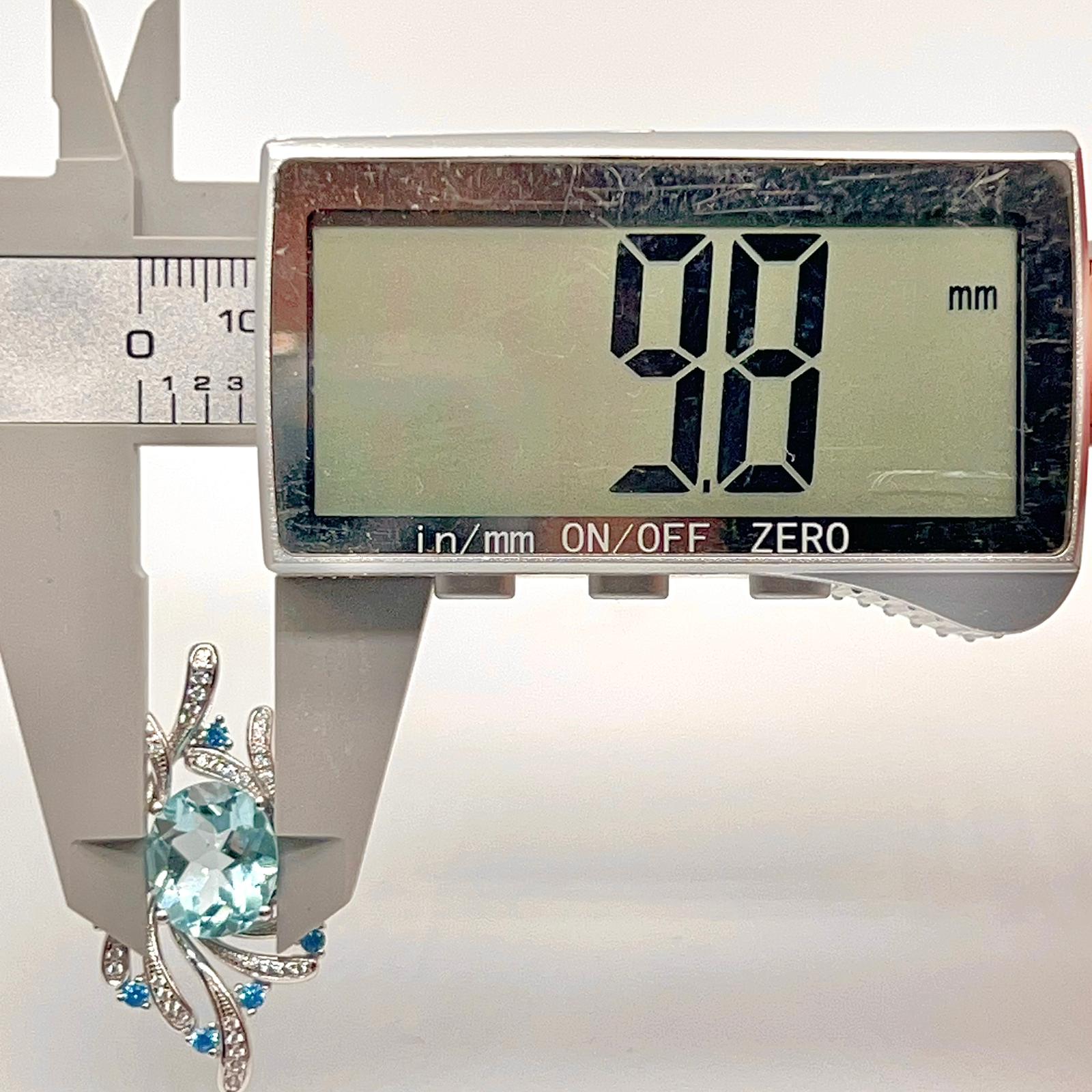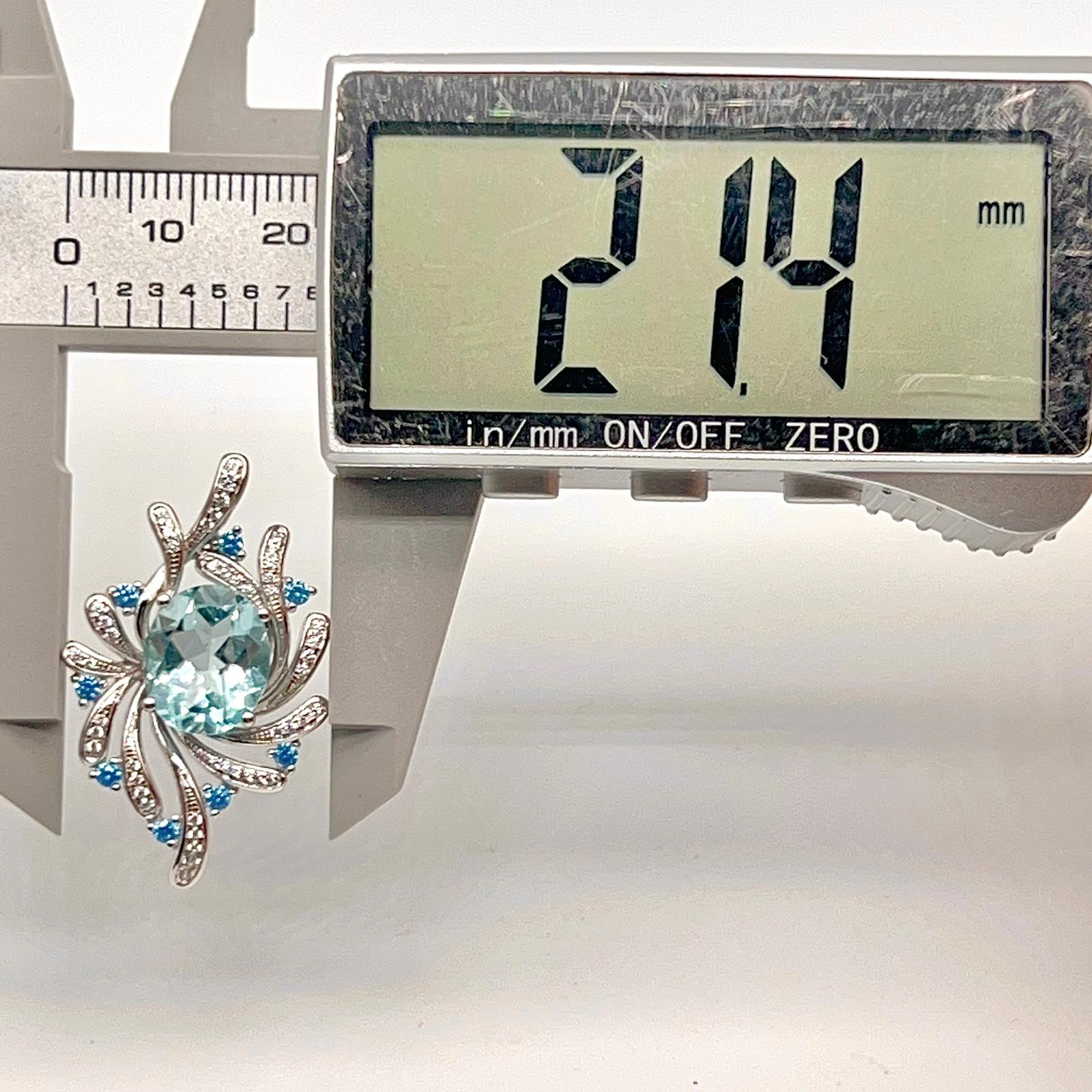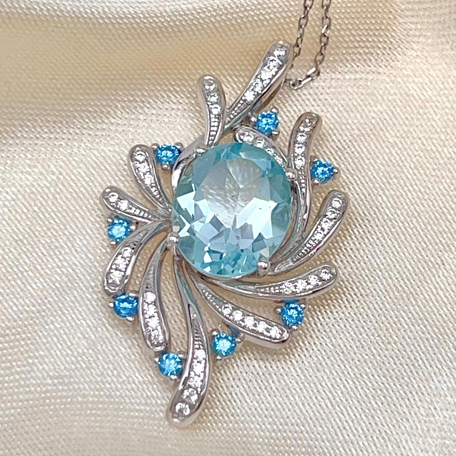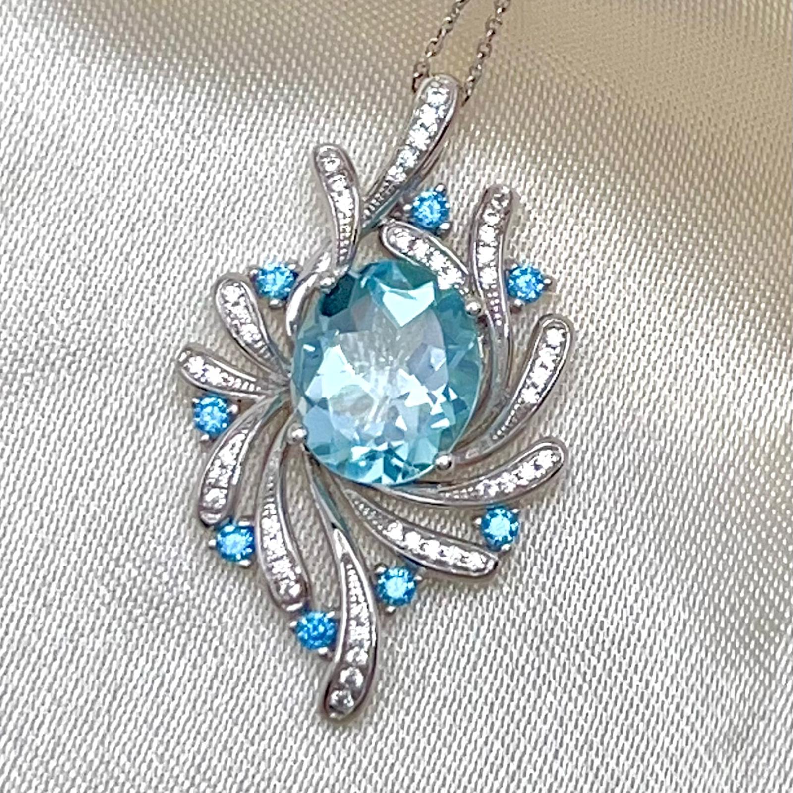 This elegant Topaz Swirl Pendant 925 showcases a central blue Topaz surrounded by a dynamic, curved setting with accent stones. The unique, flowing design is set in polished 925 sterling silver and comes with a delicate chain.