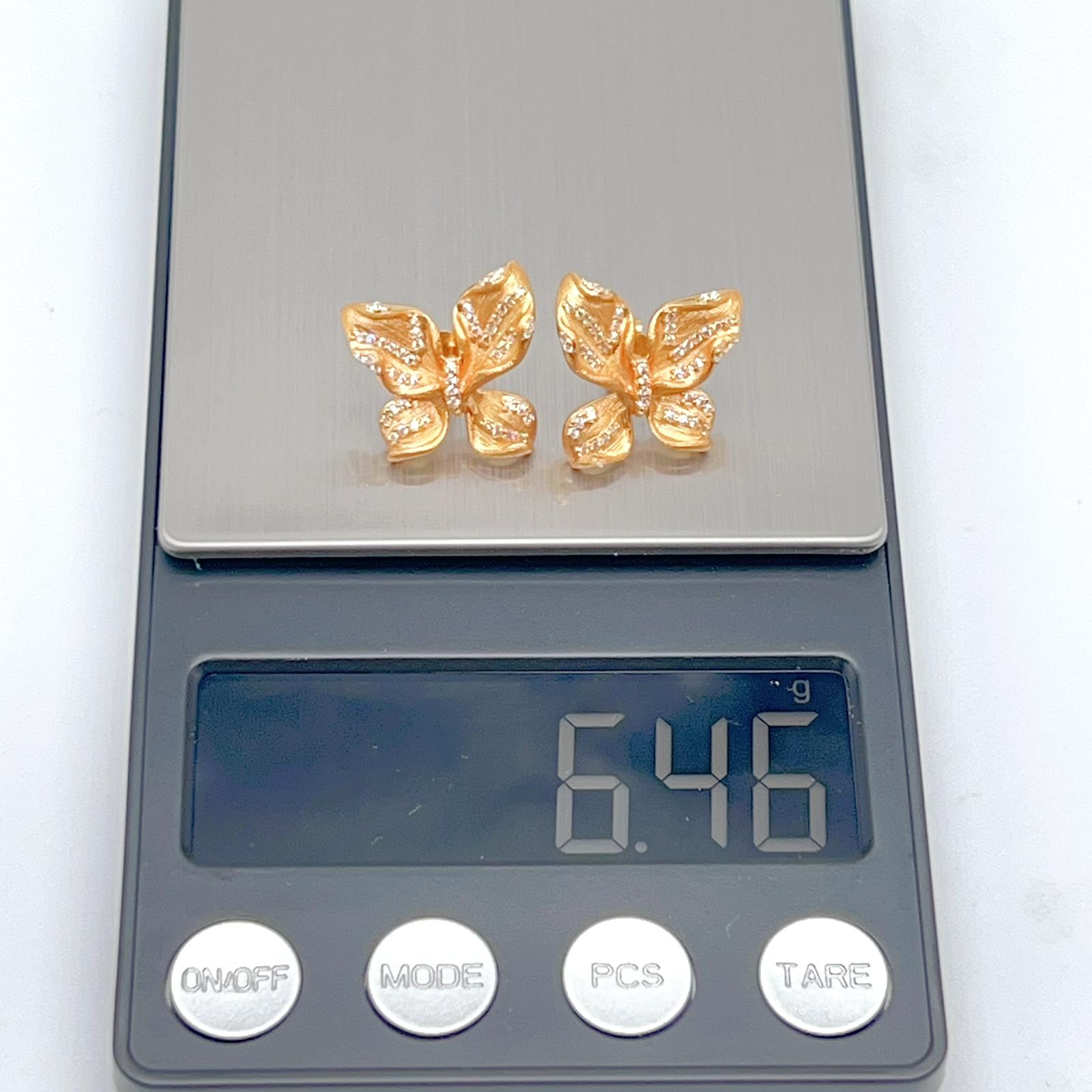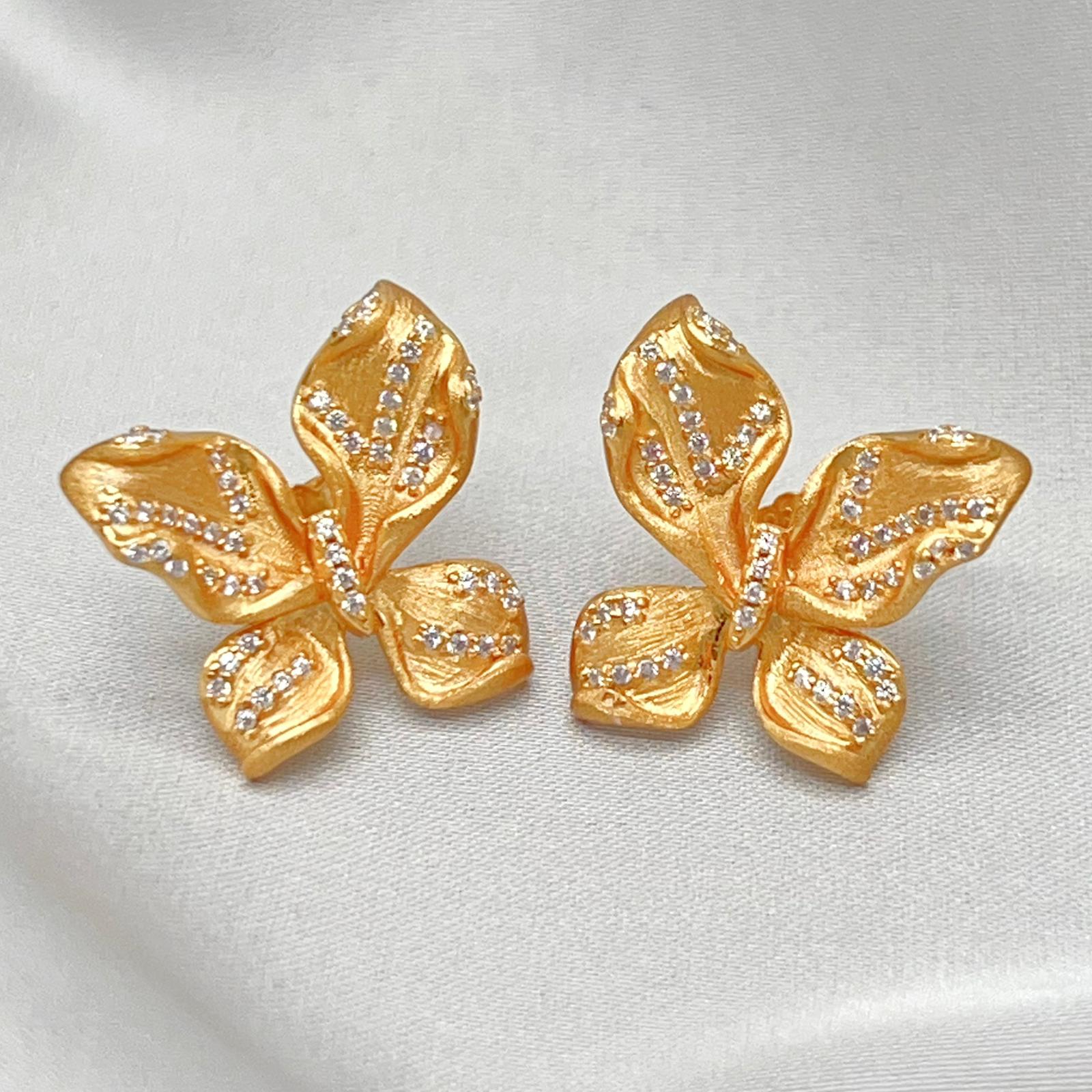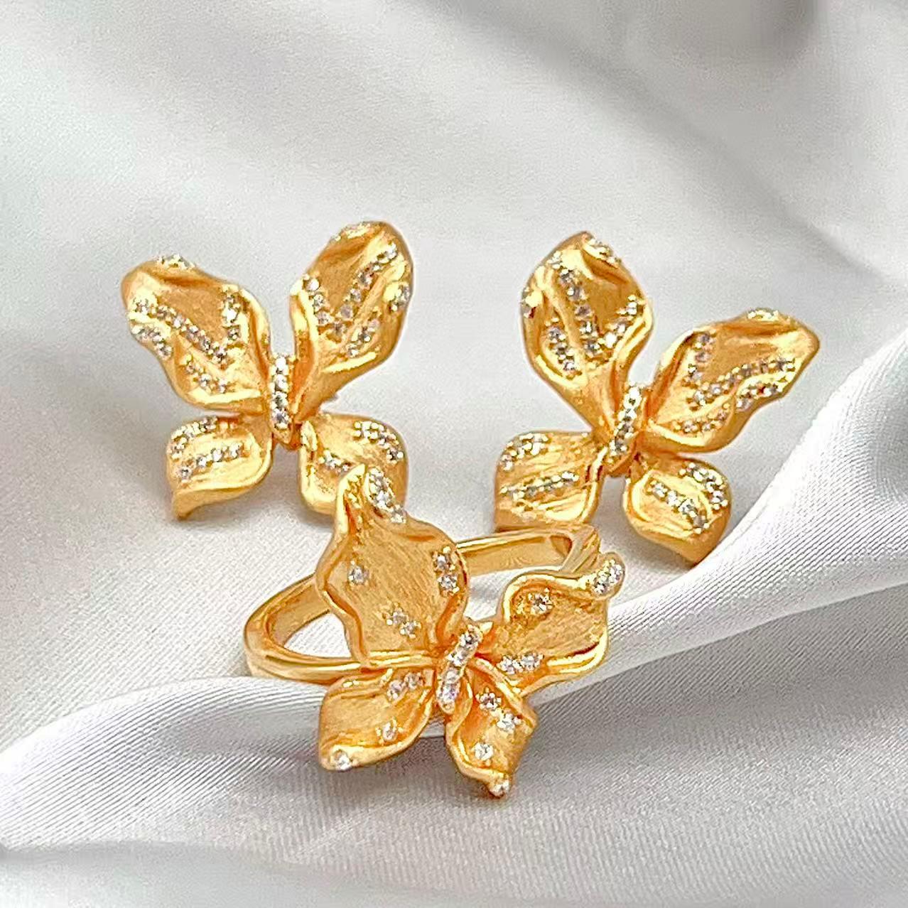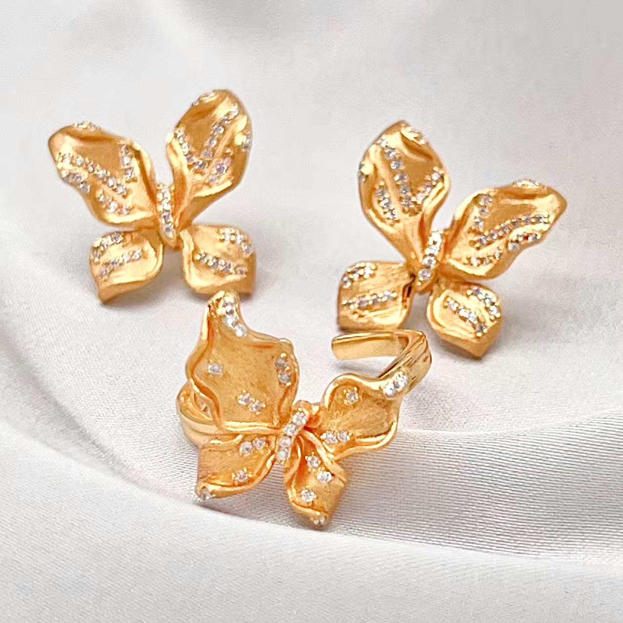 This charming Butterfly Set Matte Finish 925 features a matching ring and stud earrings in a striking, textured matte gold-tone finish. Each piece is designed as a delicate butterfly, beautifully accented with sparkling pave stones across the wings.