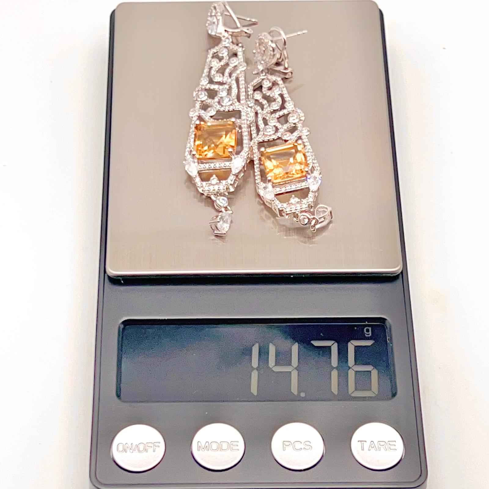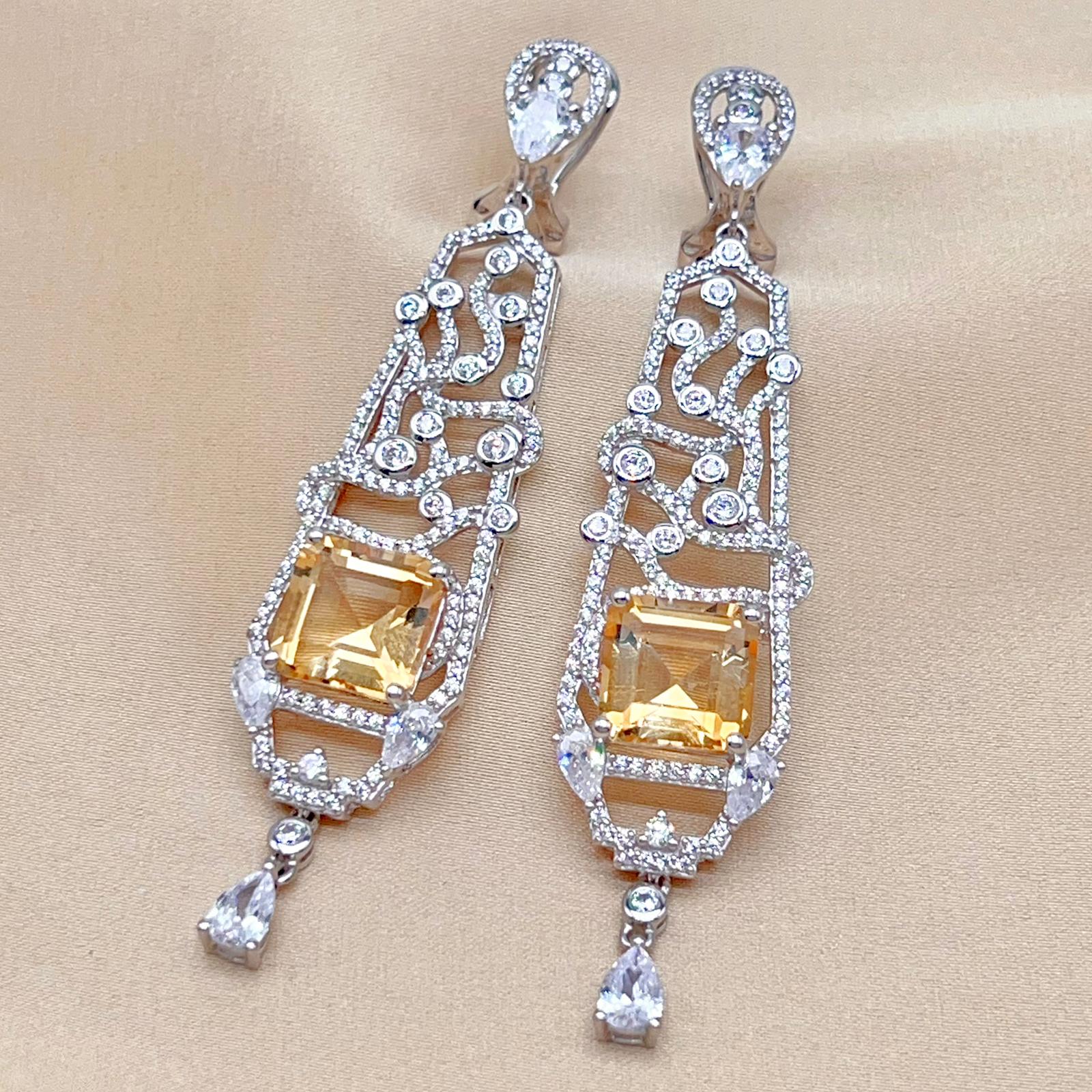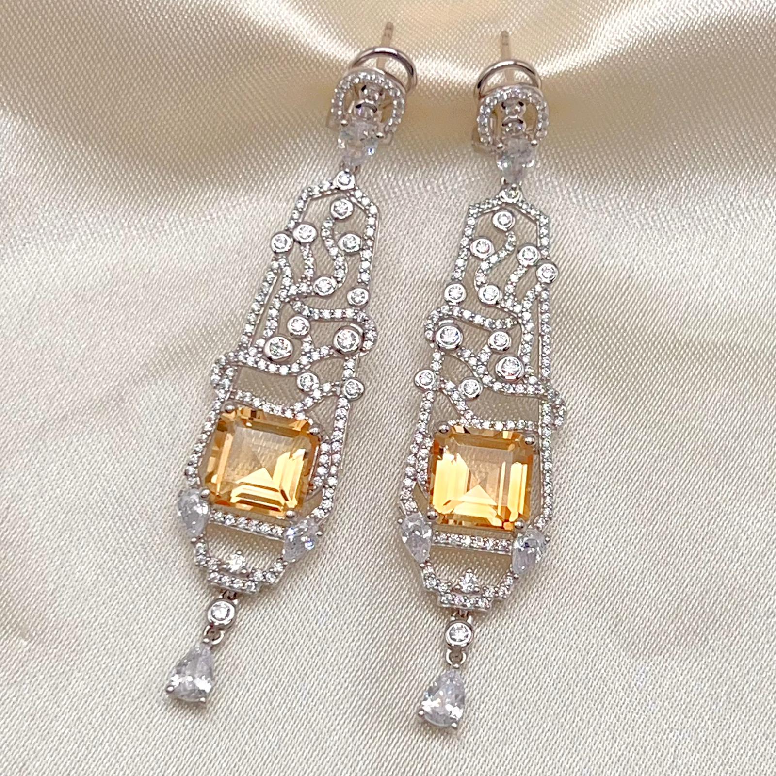 These elegant Citrine Art Deco Drops 925 showcase a brilliant rectangular-cut Citrine within a long, intricate, diamond-accented filigree frame. The luxurious 925 sterling silver design features sparkling geometric patterns and a delicate dangling pear accent.