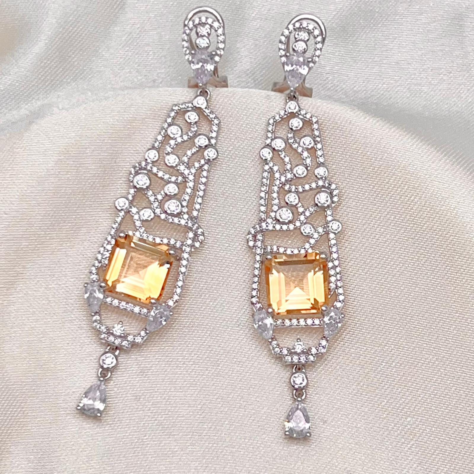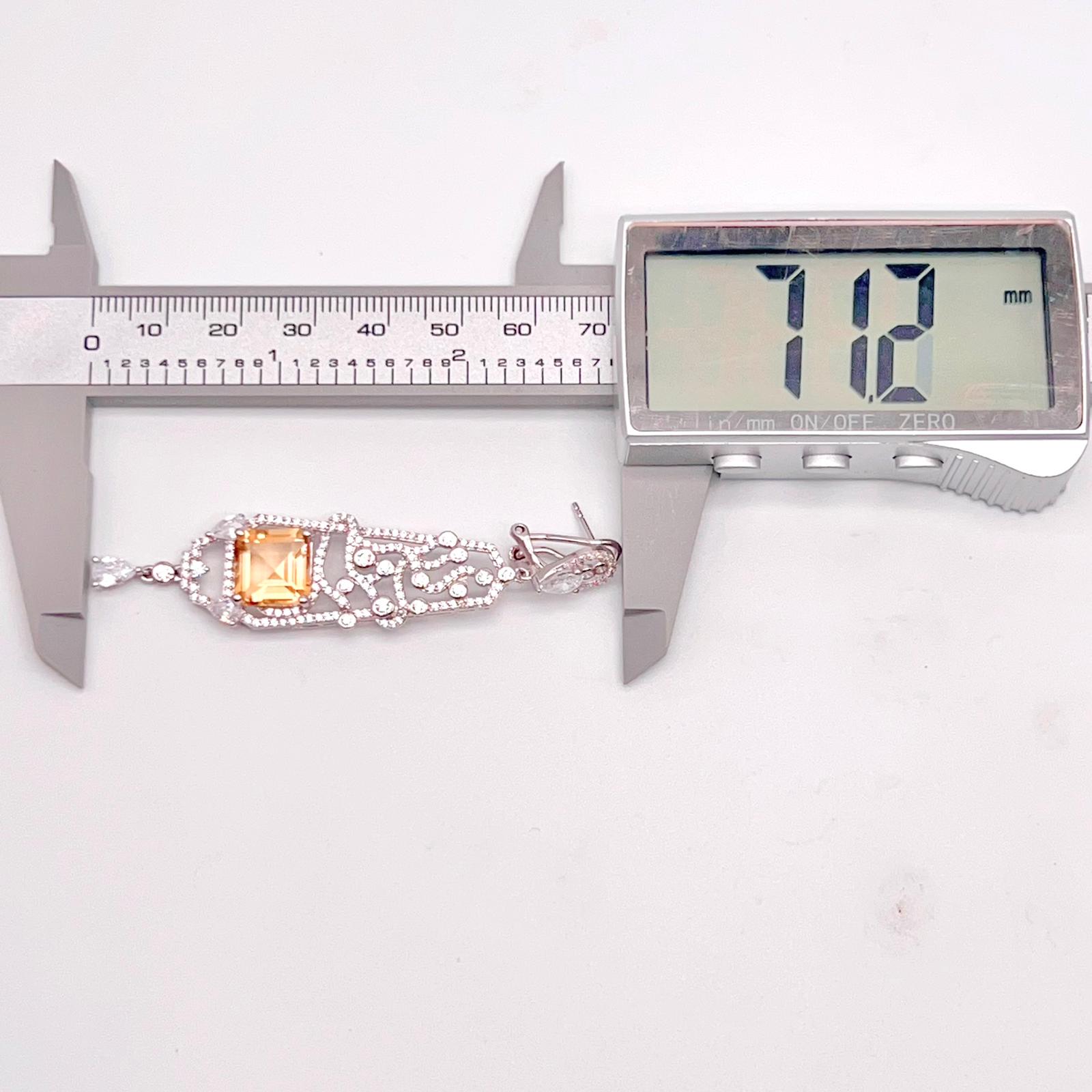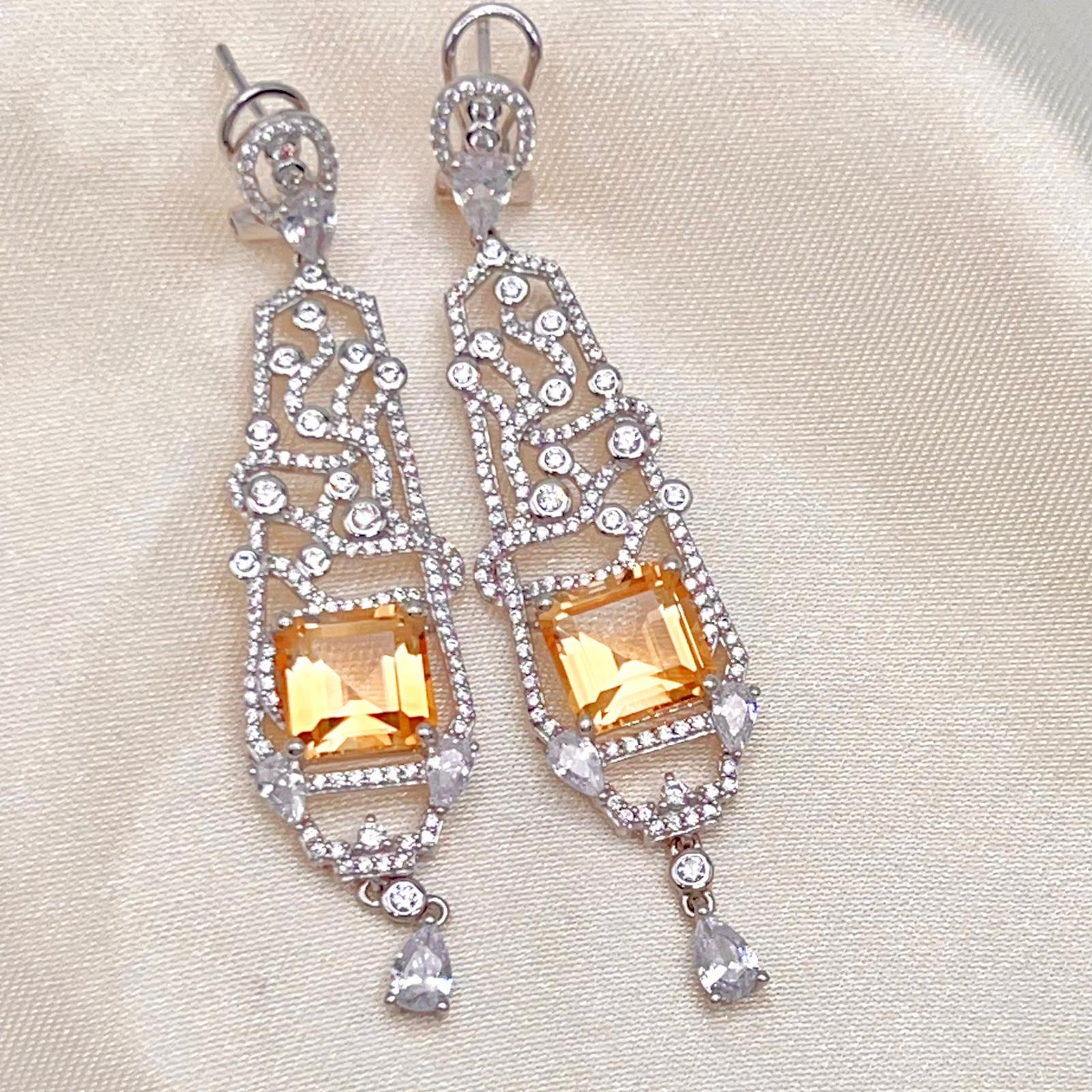 These elegant Citrine Art Deco Drops 925 showcase a brilliant rectangular-cut Citrine within a long, intricate, diamond-accented filigree frame. The luxurious 925 sterling silver design features sparkling geometric patterns and a delicate dangling pear accent.