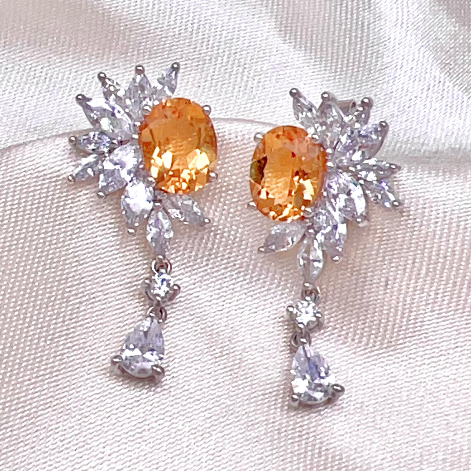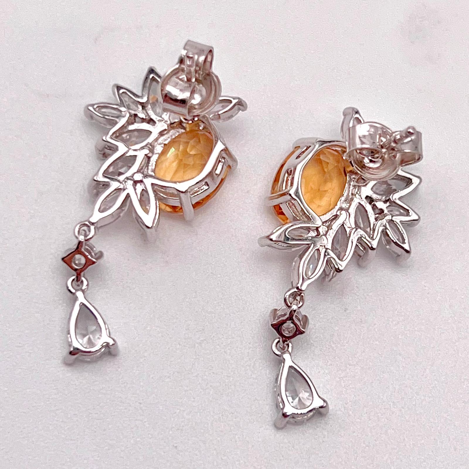 This striking pair of Citrine Cluster Dangle Earrings 925 showcases a brilliant oval-cut Citrine as the center of a dramatic, flower-like halo. The sparkling setting features marquise-cut accents and a cascading dangle with a pear-cut stone, all set in bright 925 Silver.