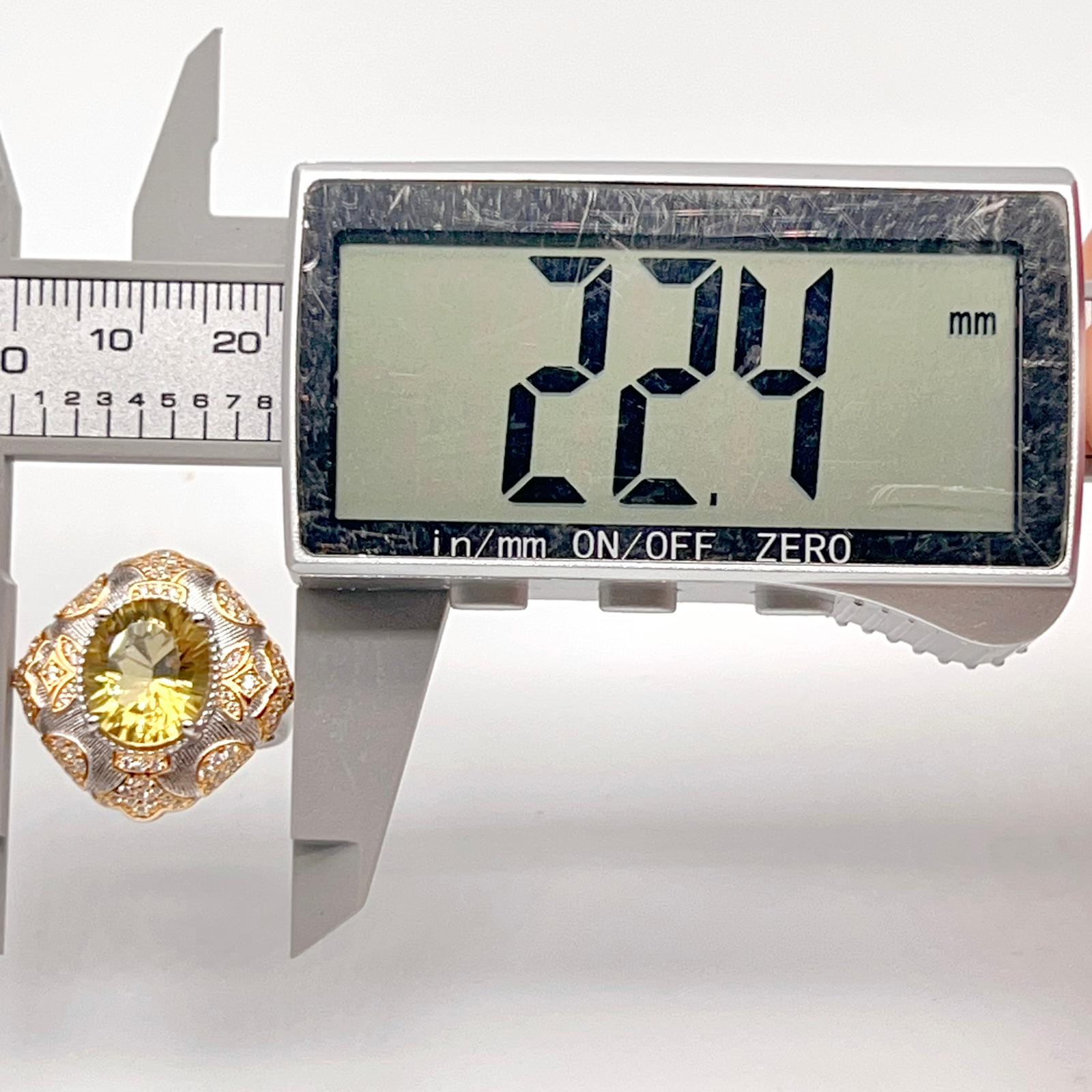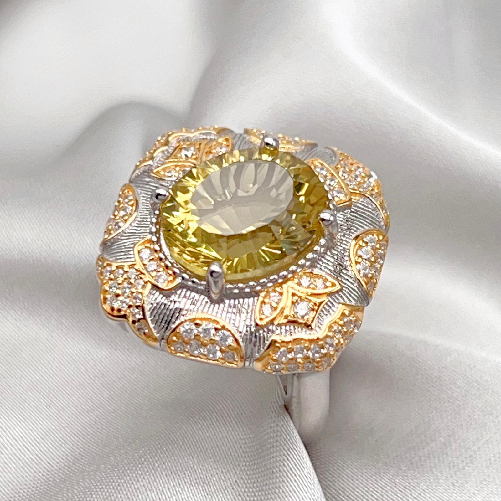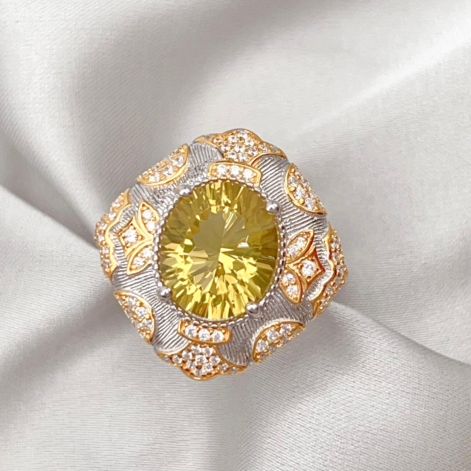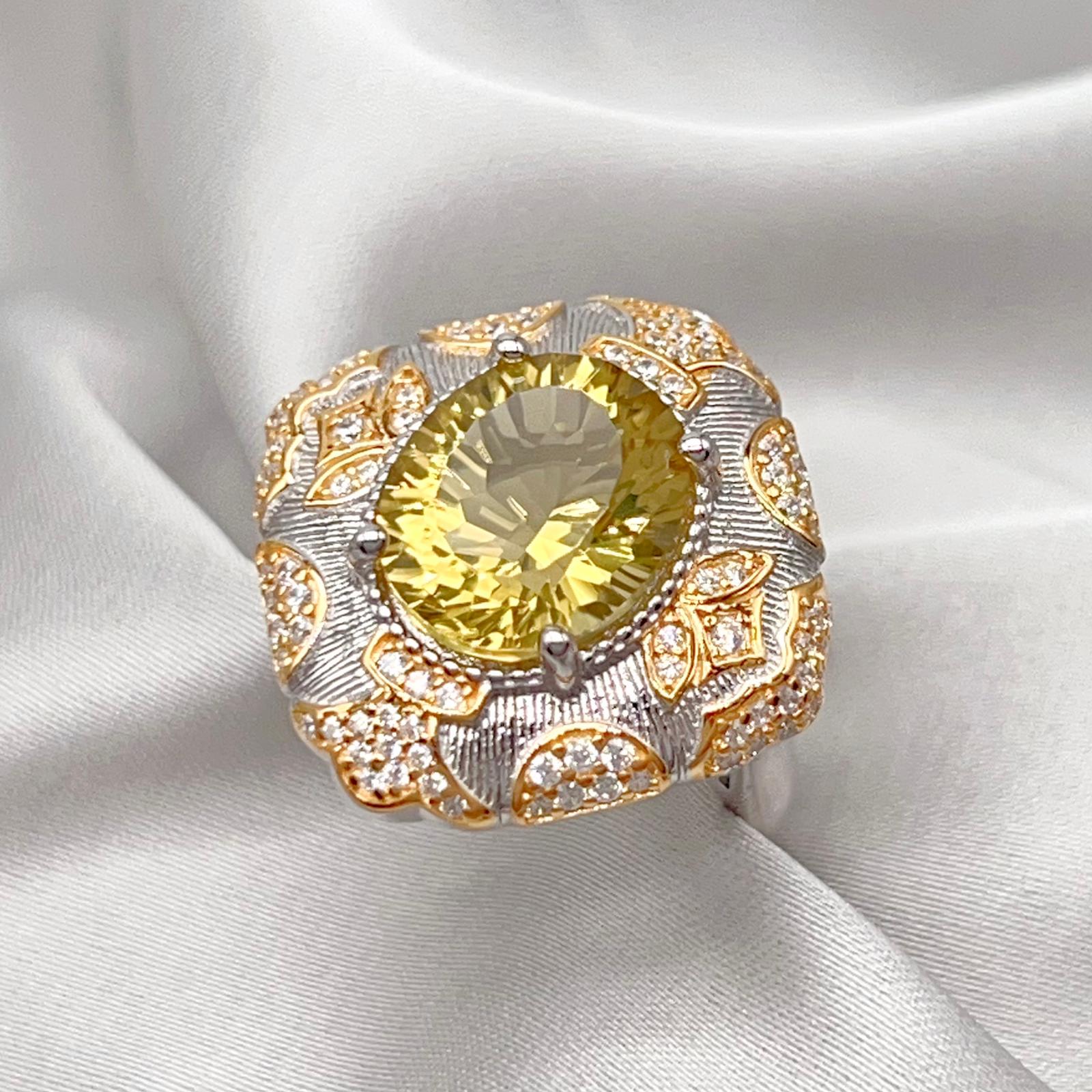 This spectacular Citrine Two-Tone Statement Ring 925 showcases a bright oval-cut Citrine set within a highly detailed square frame. The unique design features gold-tone floral accents and sparkling pave stones over the 925 silver setting.