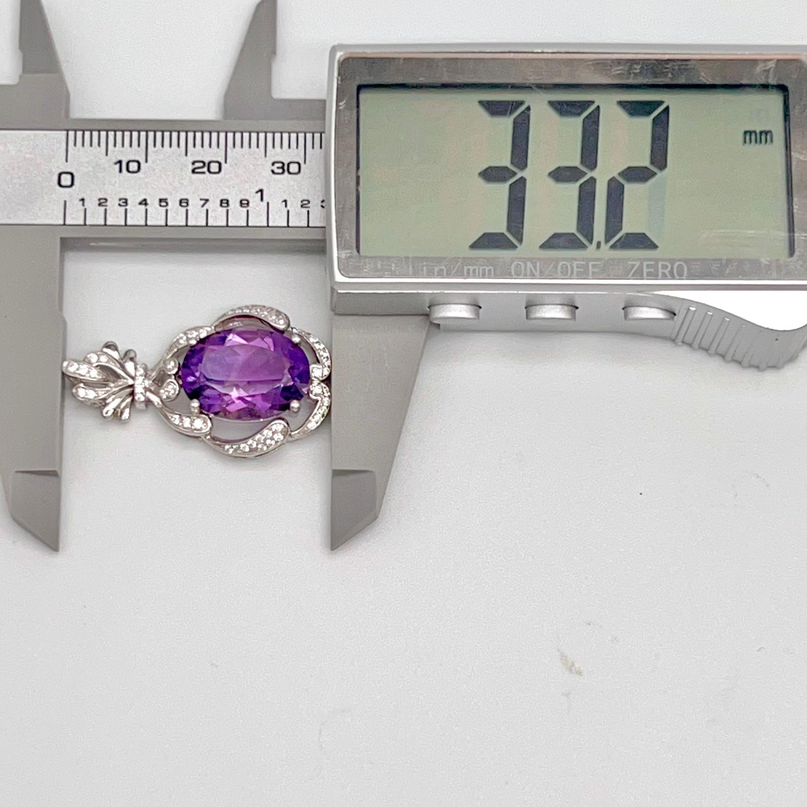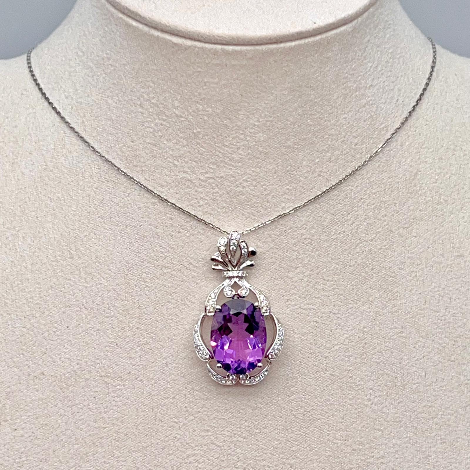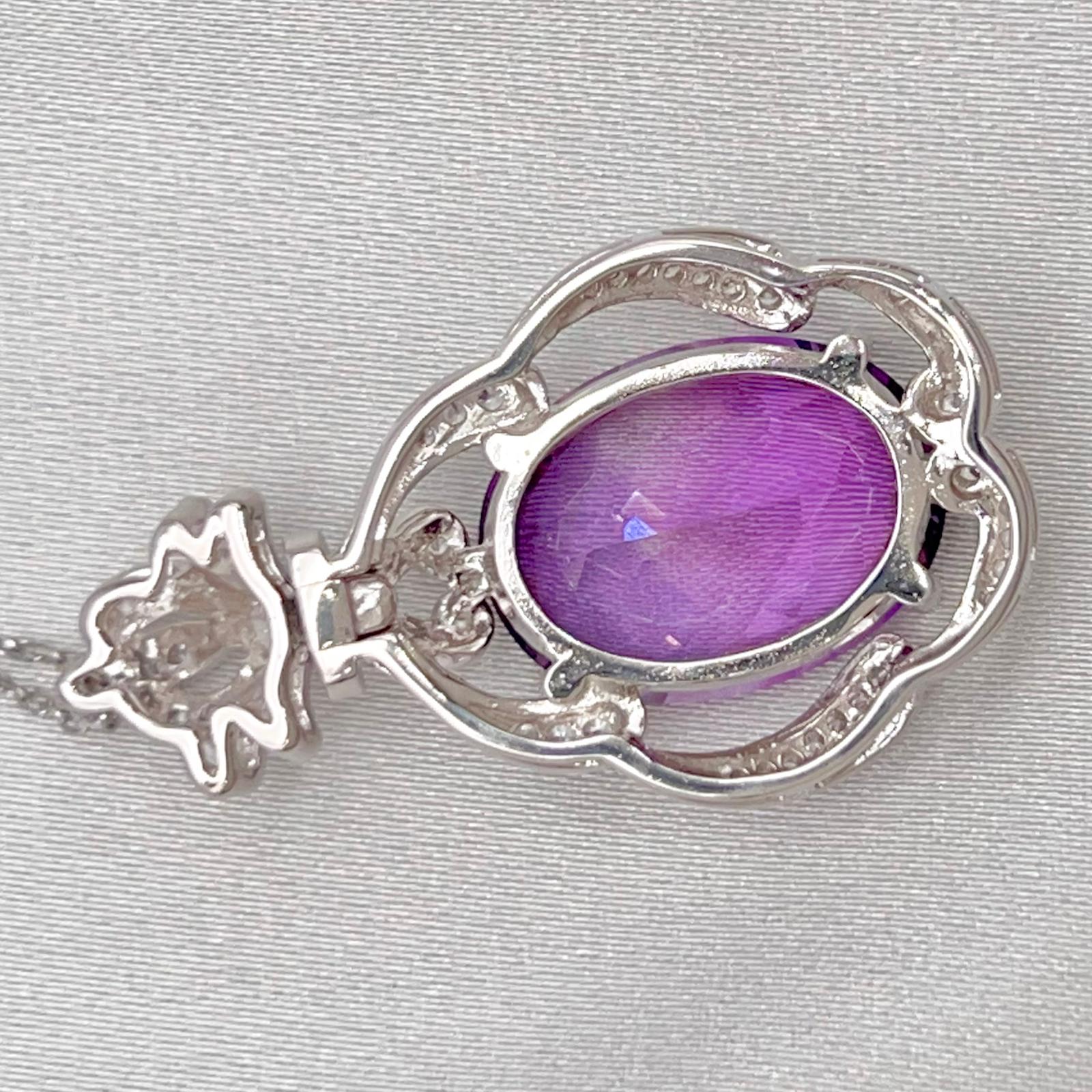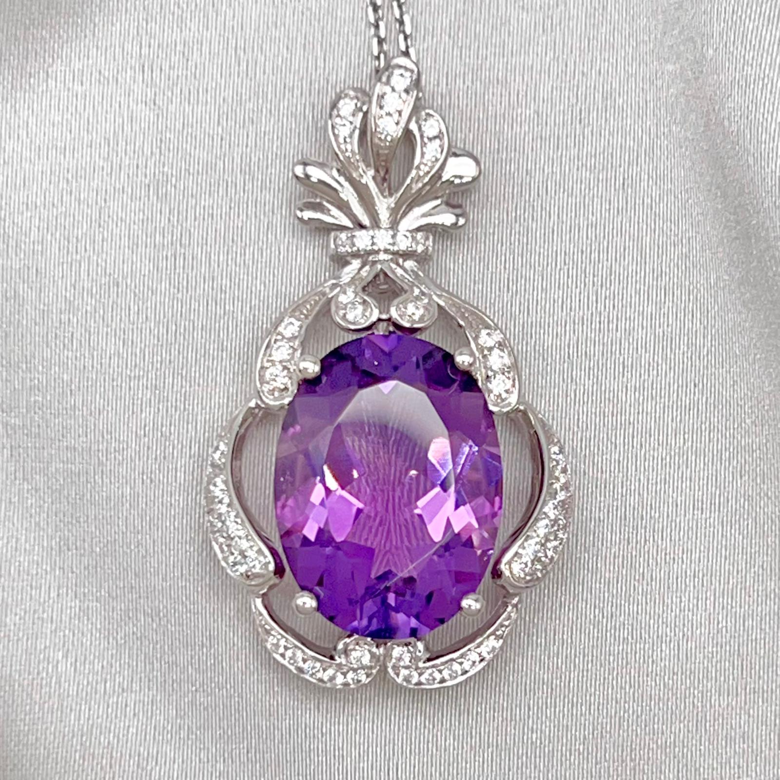 This striking Contemporary Cocktail Necklace showcases a magnificent Oval Amethyst centered within a textured Baroque Frame. Crafted in 925 Sterling Silver, the intricate two-tone openwork design is finished with a sparkling baguette accent on the bail for a luxurious statement look.