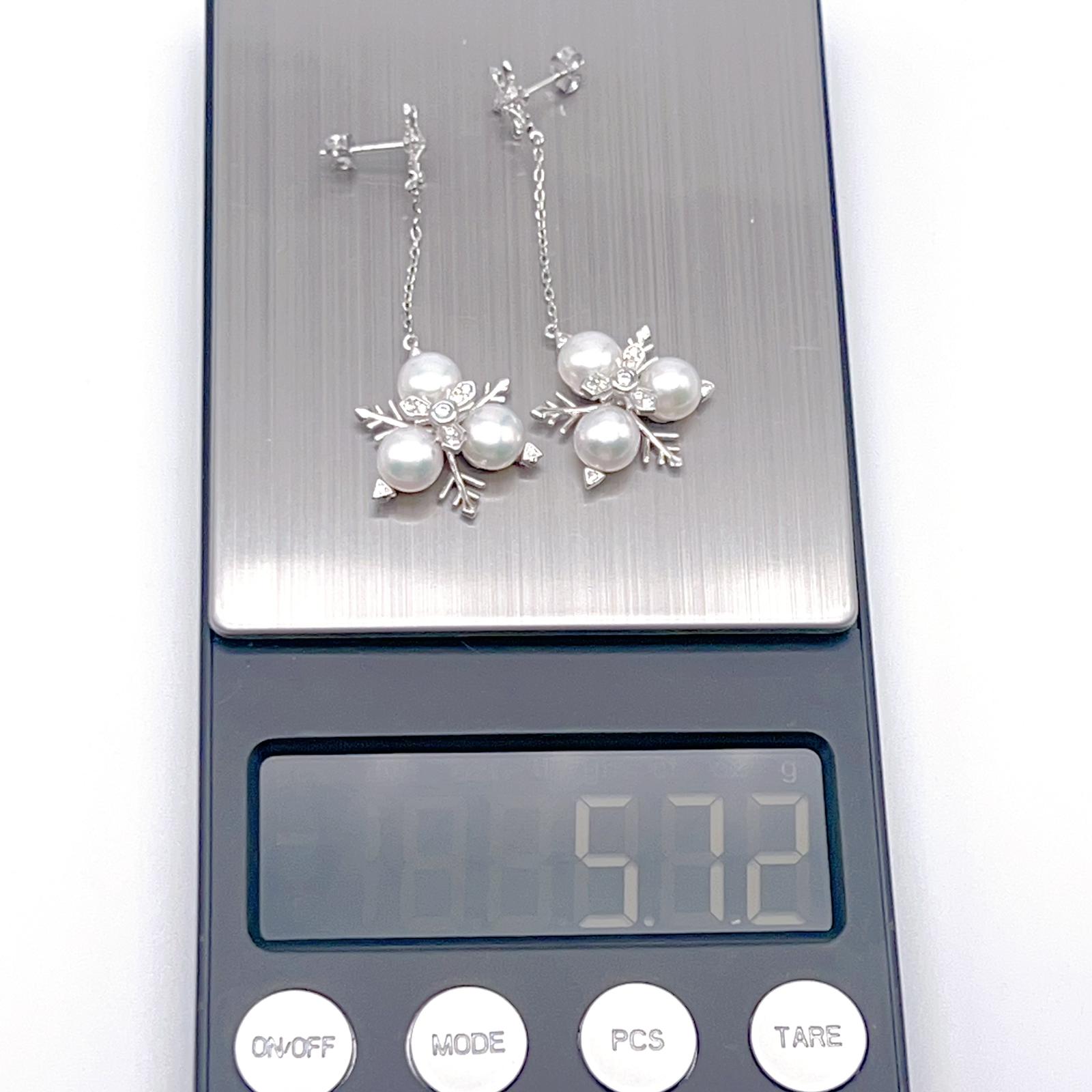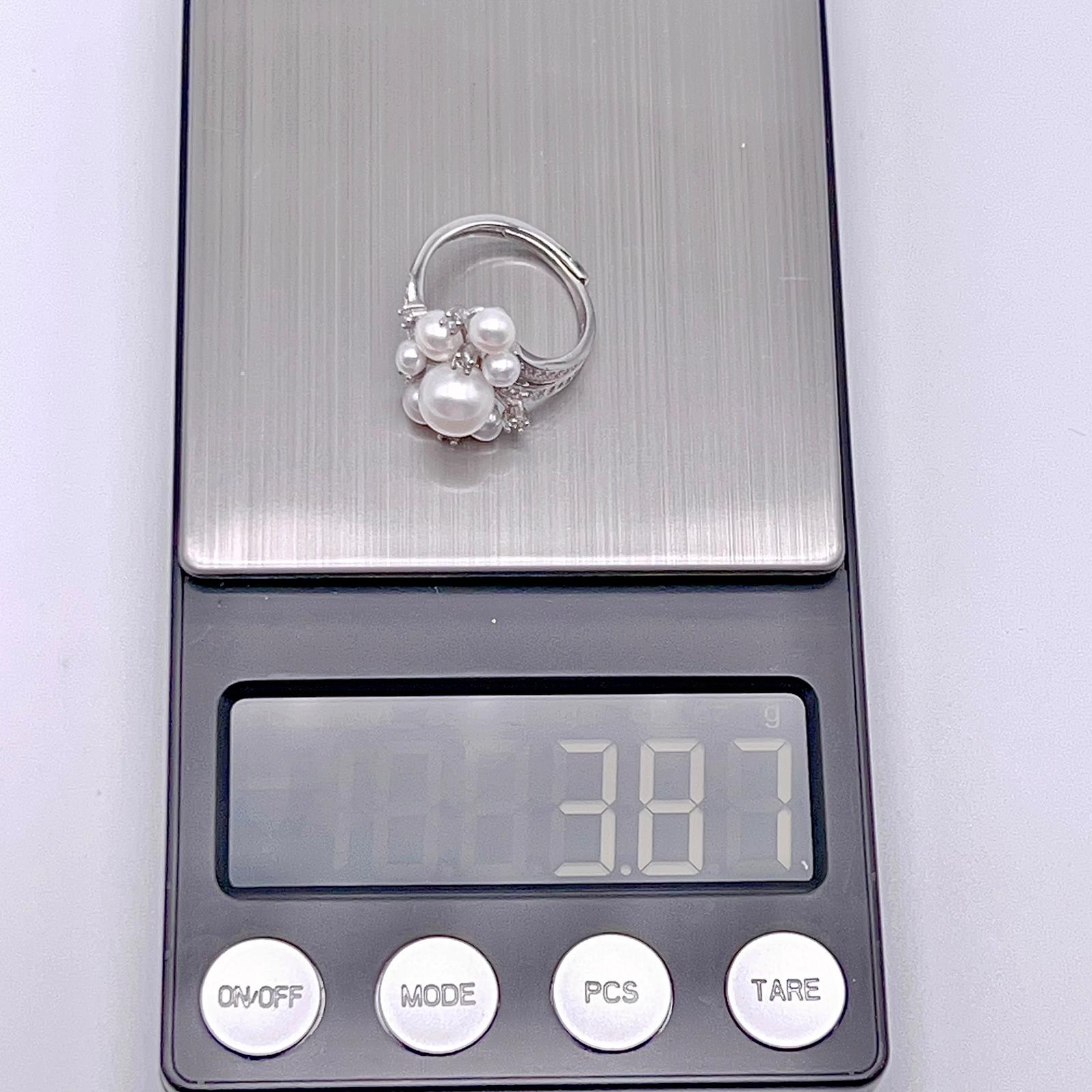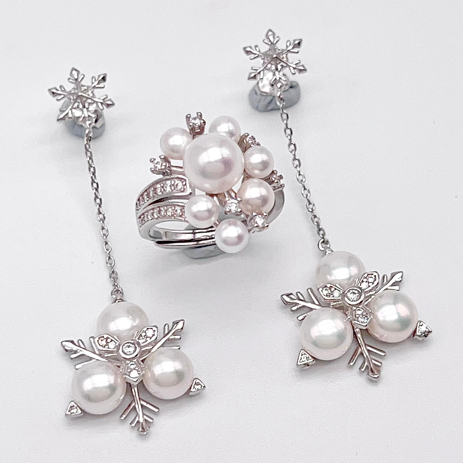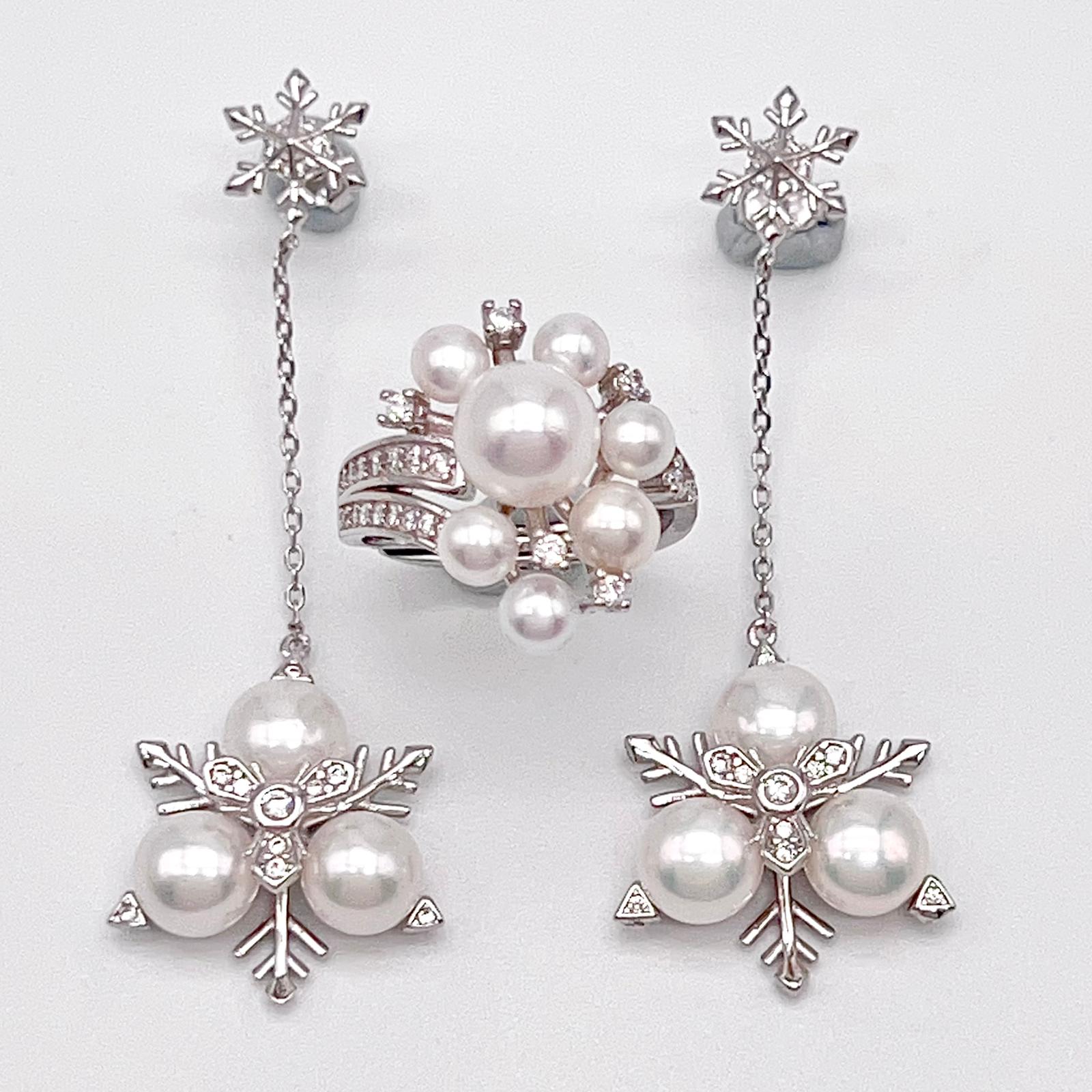 Contemporary Cocktail. Earring and Ring of Pearl Set in Silver 925. Triangular Snowflake