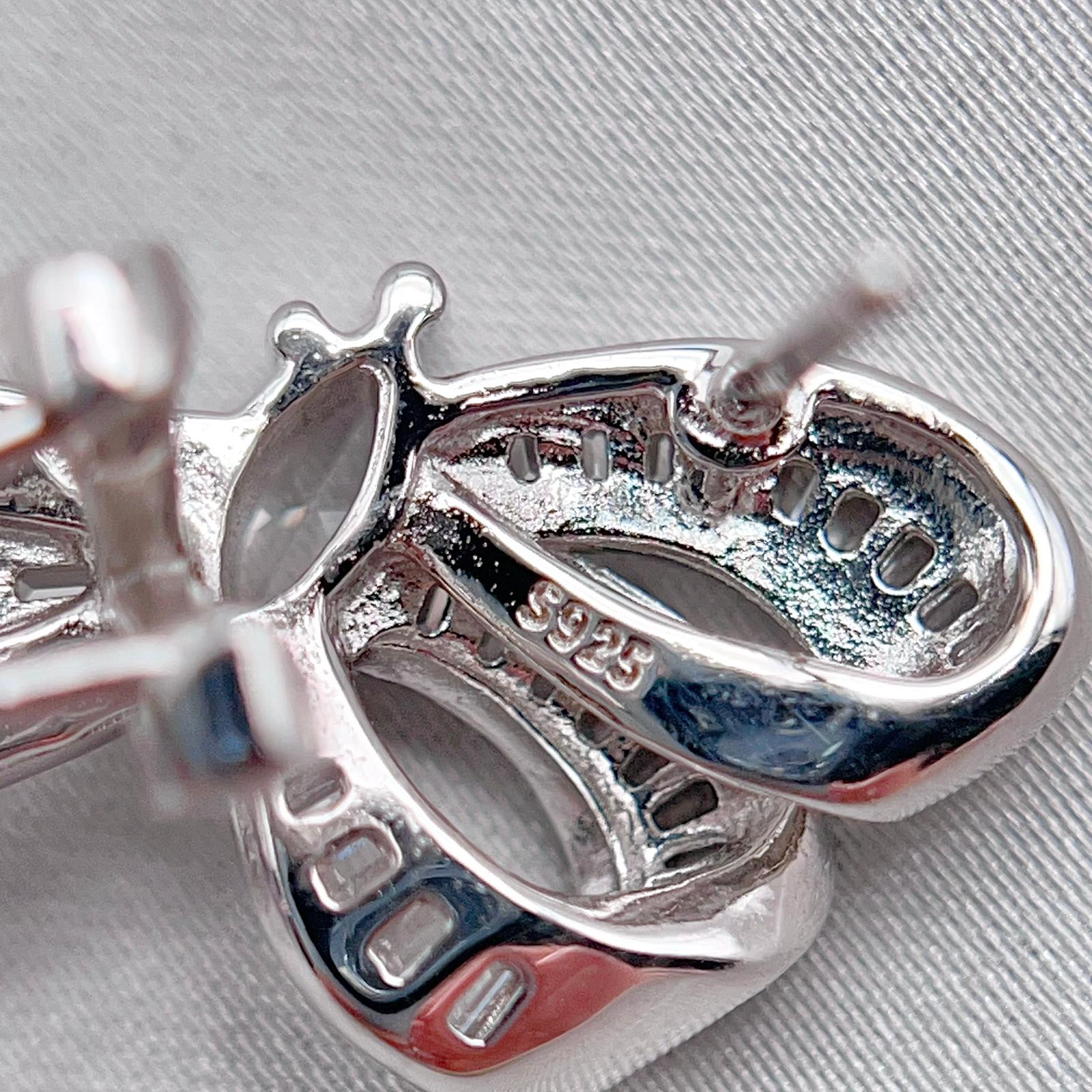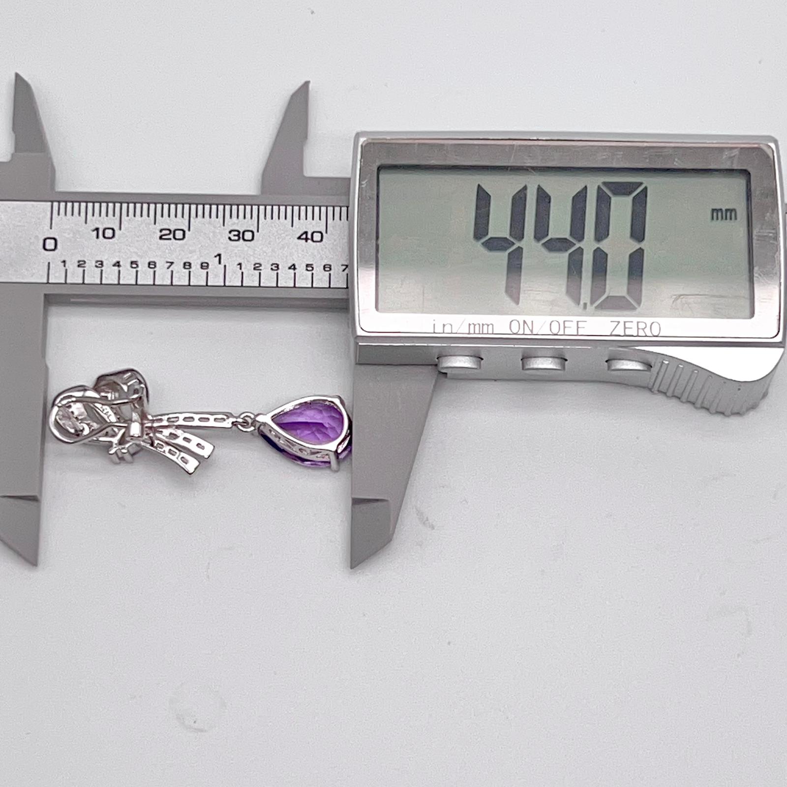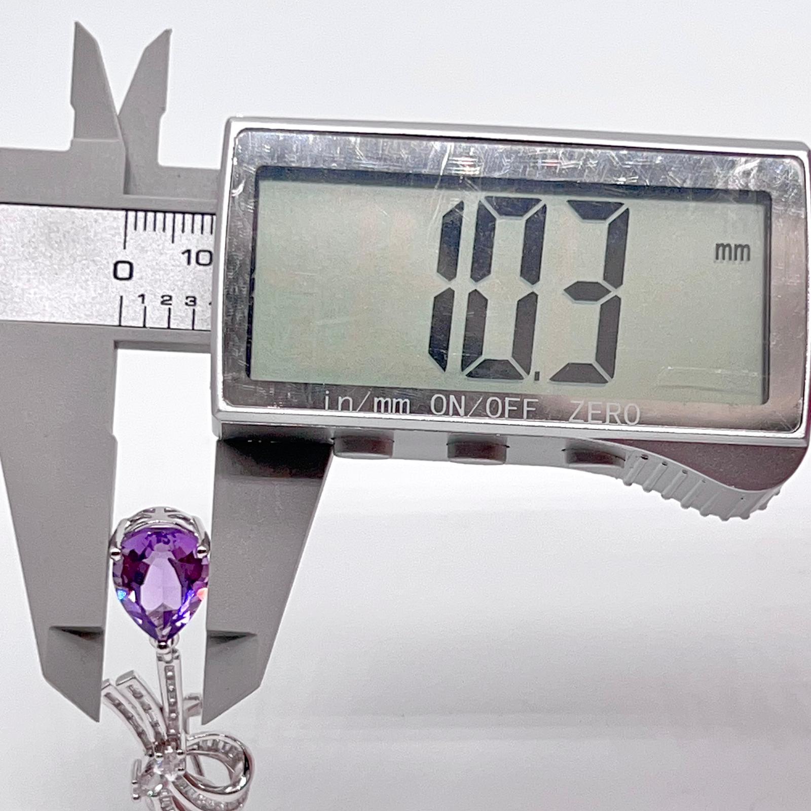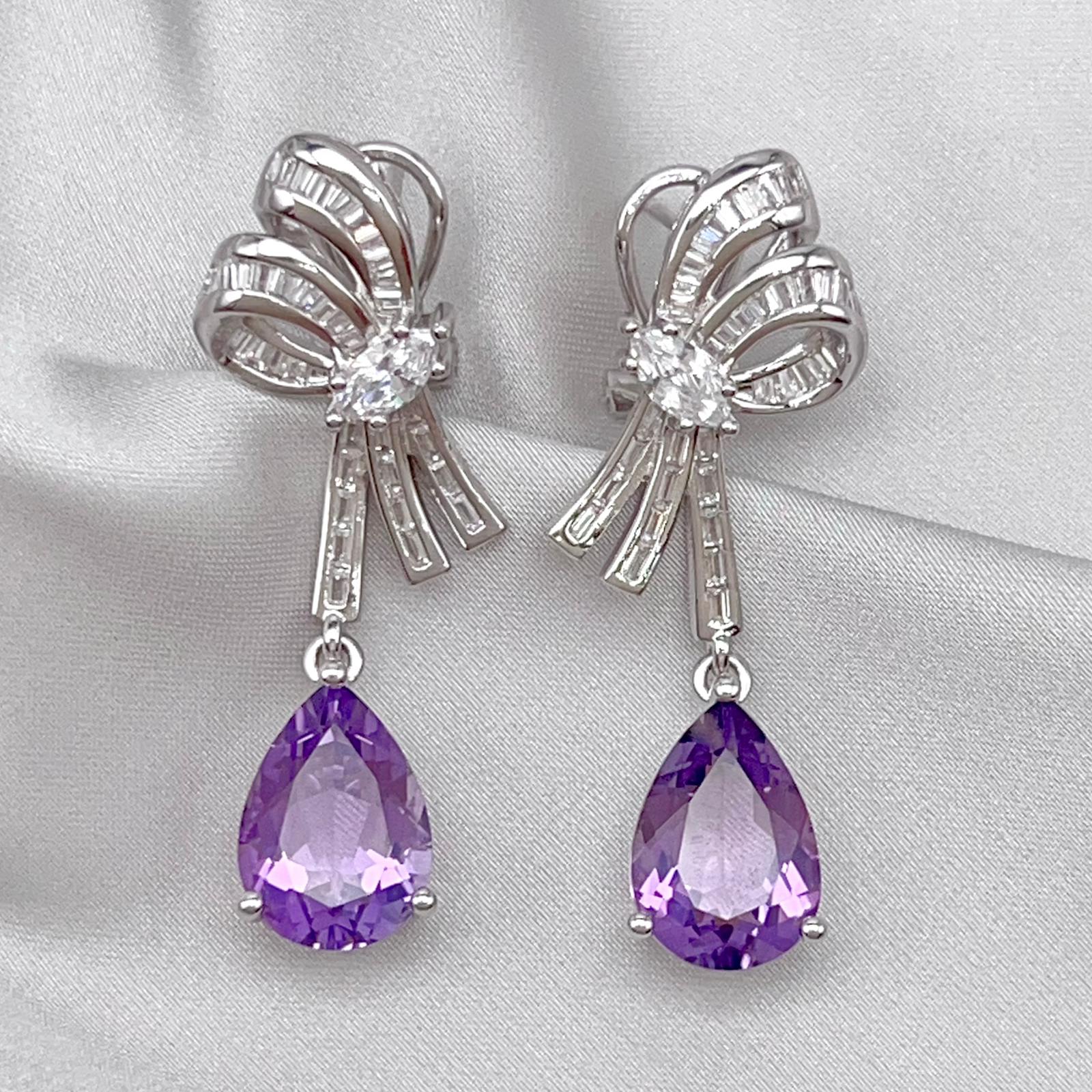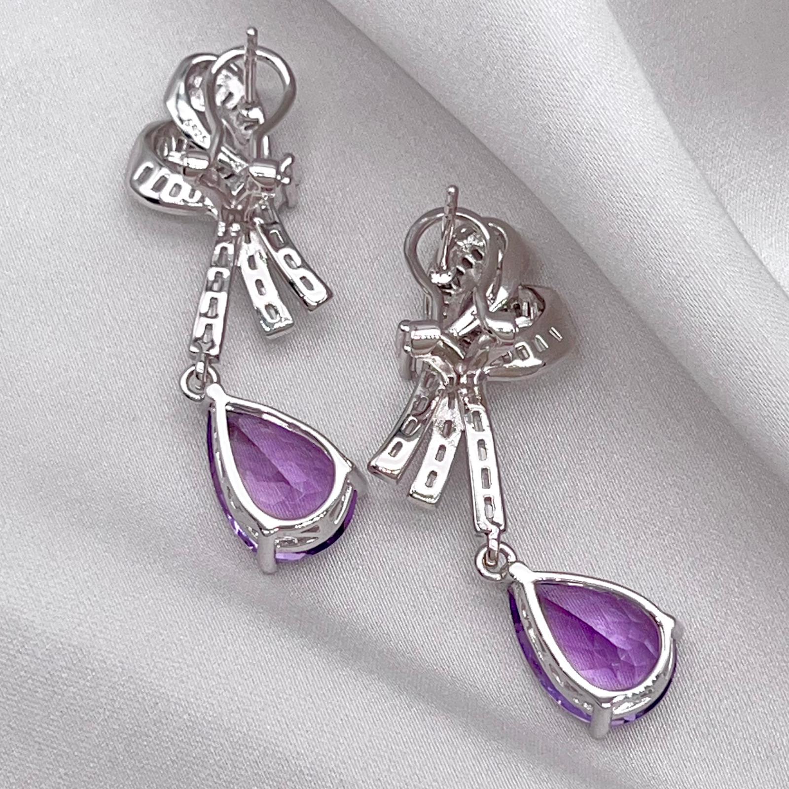 These contemporary cocktail earrings feature a stunning pear-cut Amethyst drop suspended from a delicate, sparkling silver ribbon motif. Crafted in 925 Sterling Silver, the bow design is encrusted with white stones, adding a touch of glamour and movement.