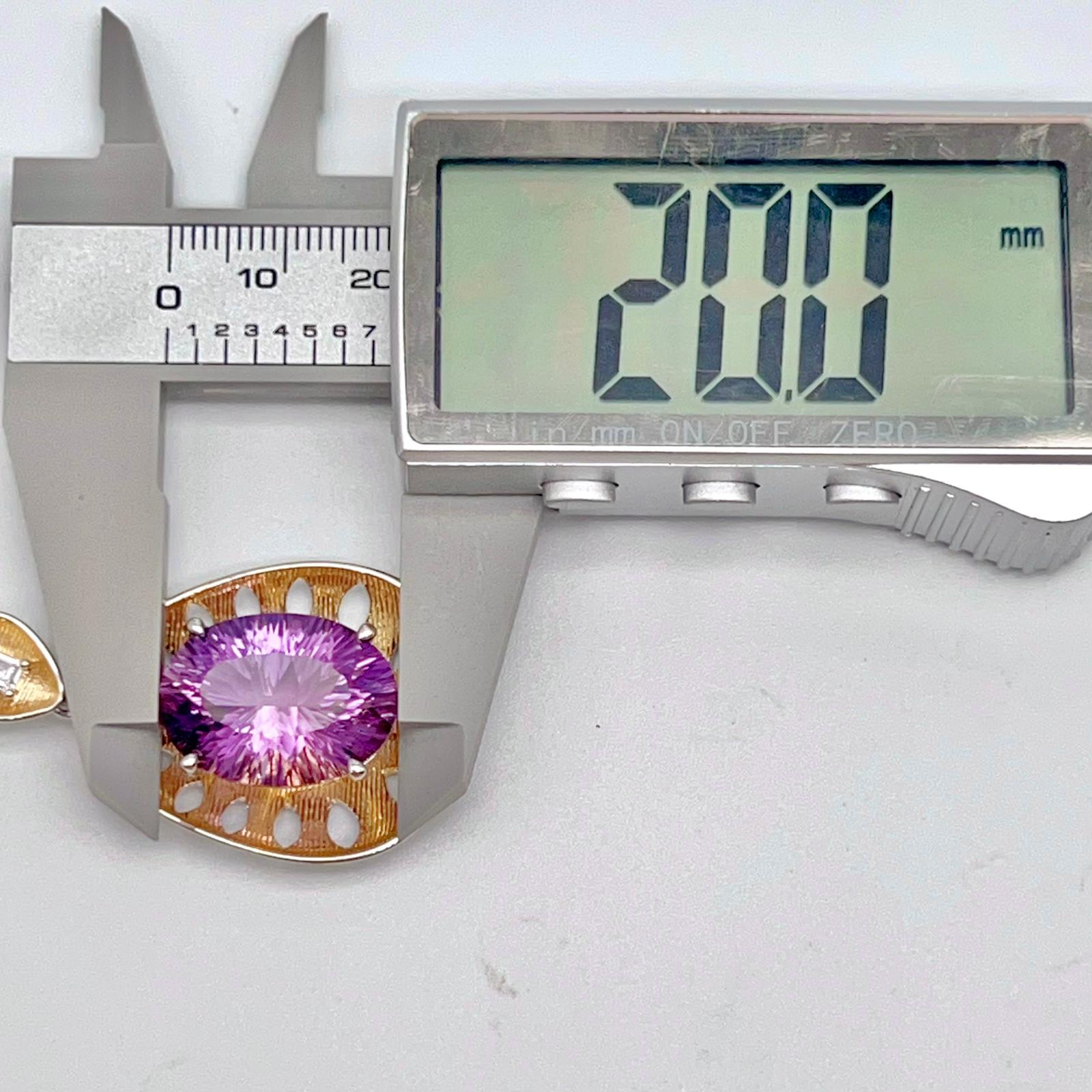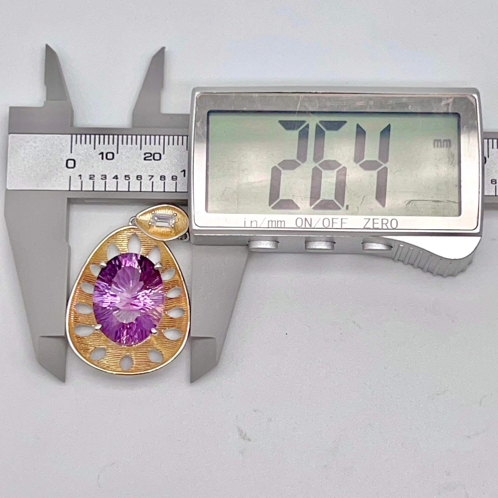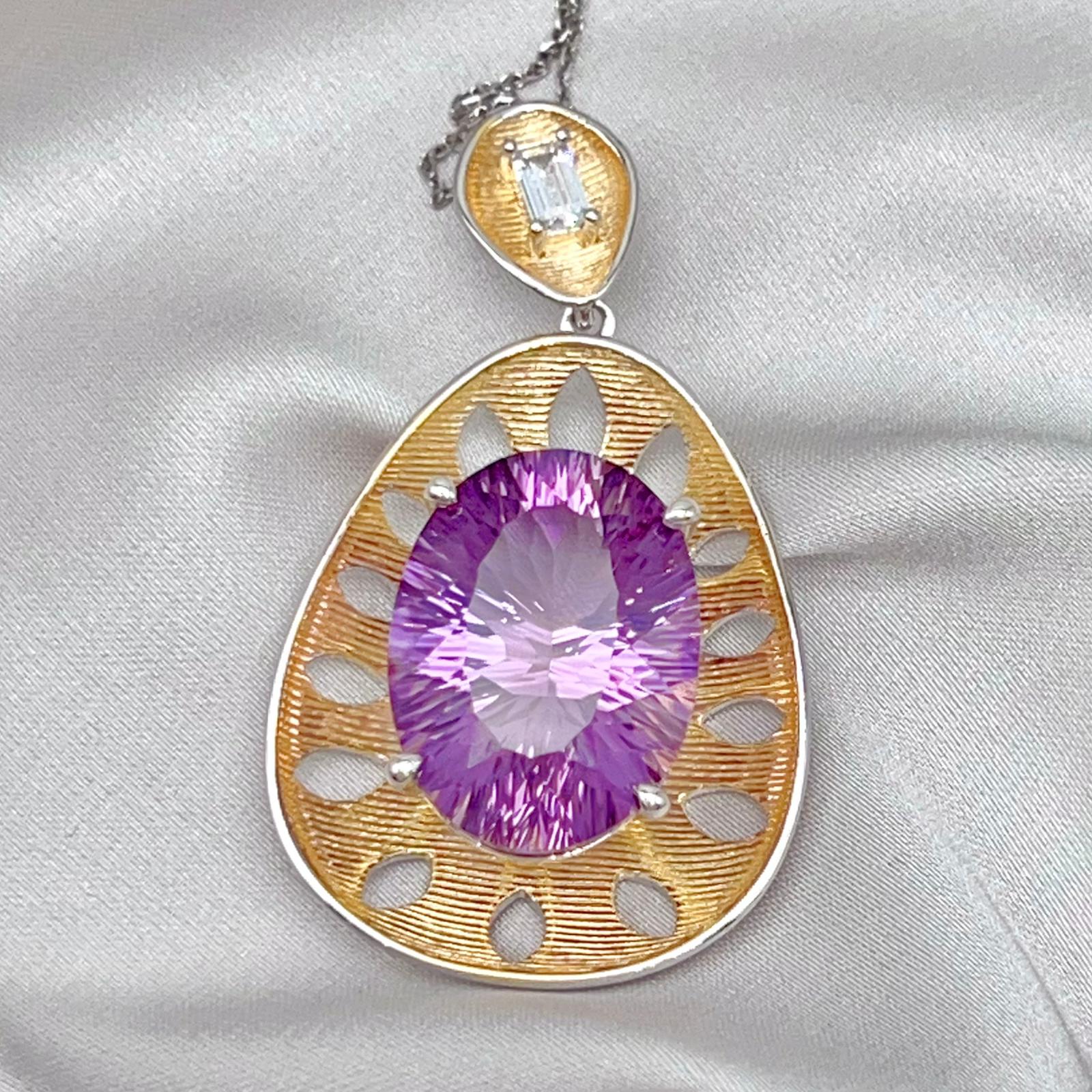 This Contemporary Cocktail Necklace features a striking Oval Amethyst cabochon as its focal point. The gemstone is framed by a gold-tone bezel and set against a sculptural, textured 925 Sterling Silver background, creating a bold modernist look.