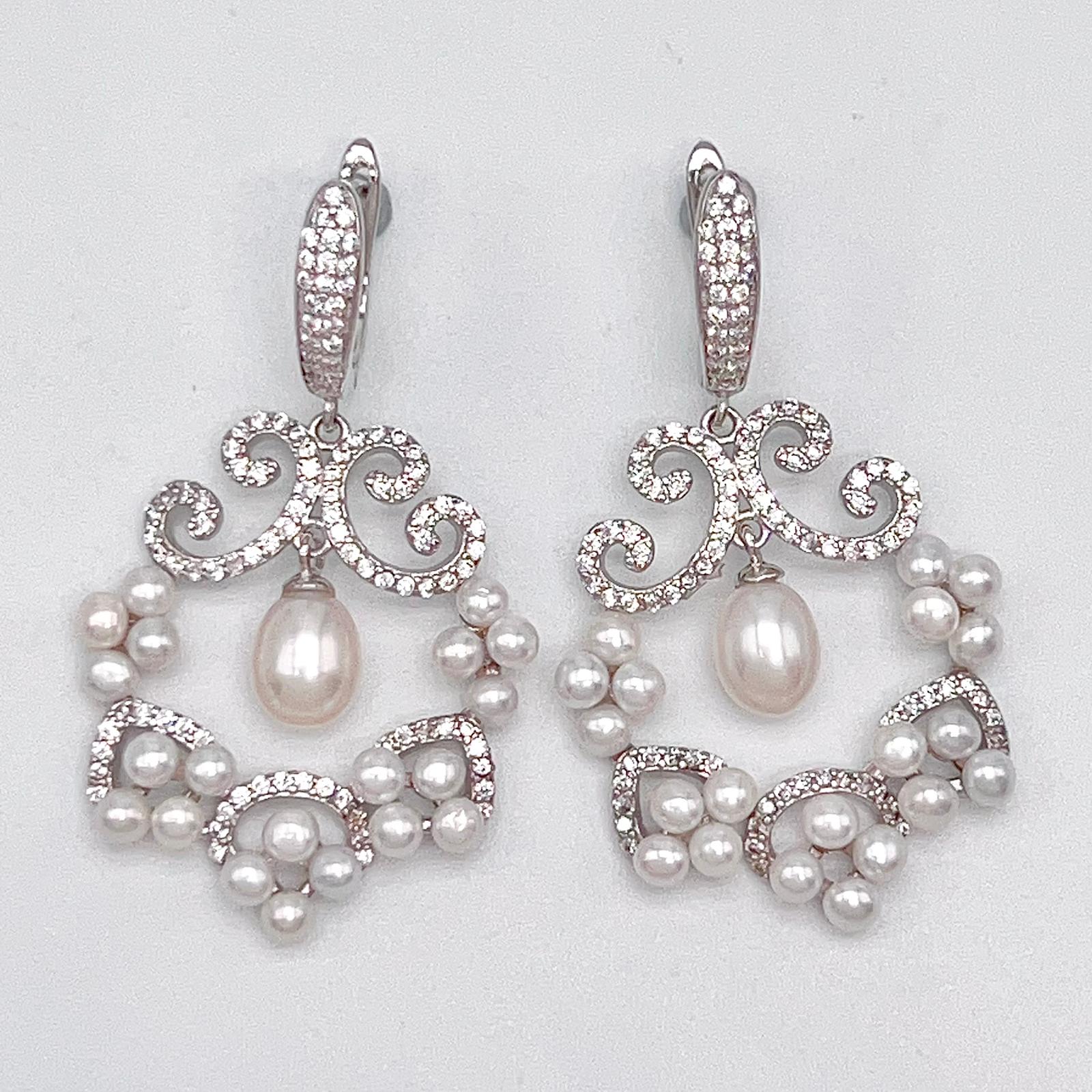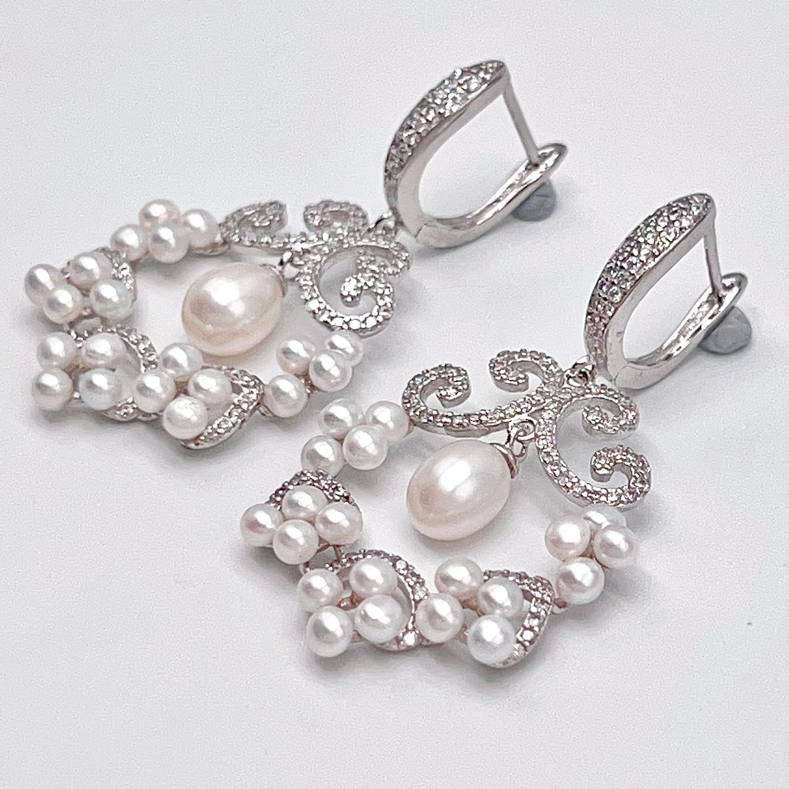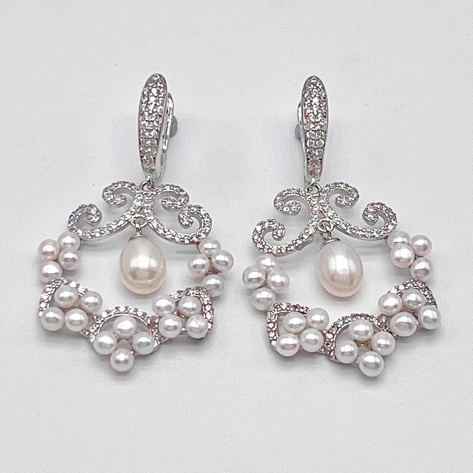 Cultured Pearl Cluster Scroll Dangle Earrings Silver 925
