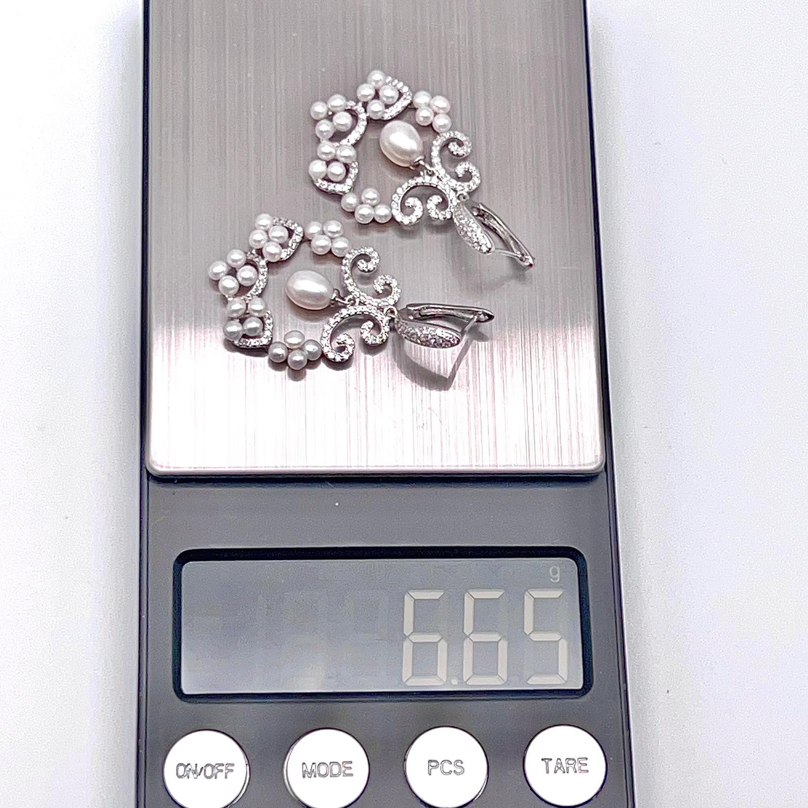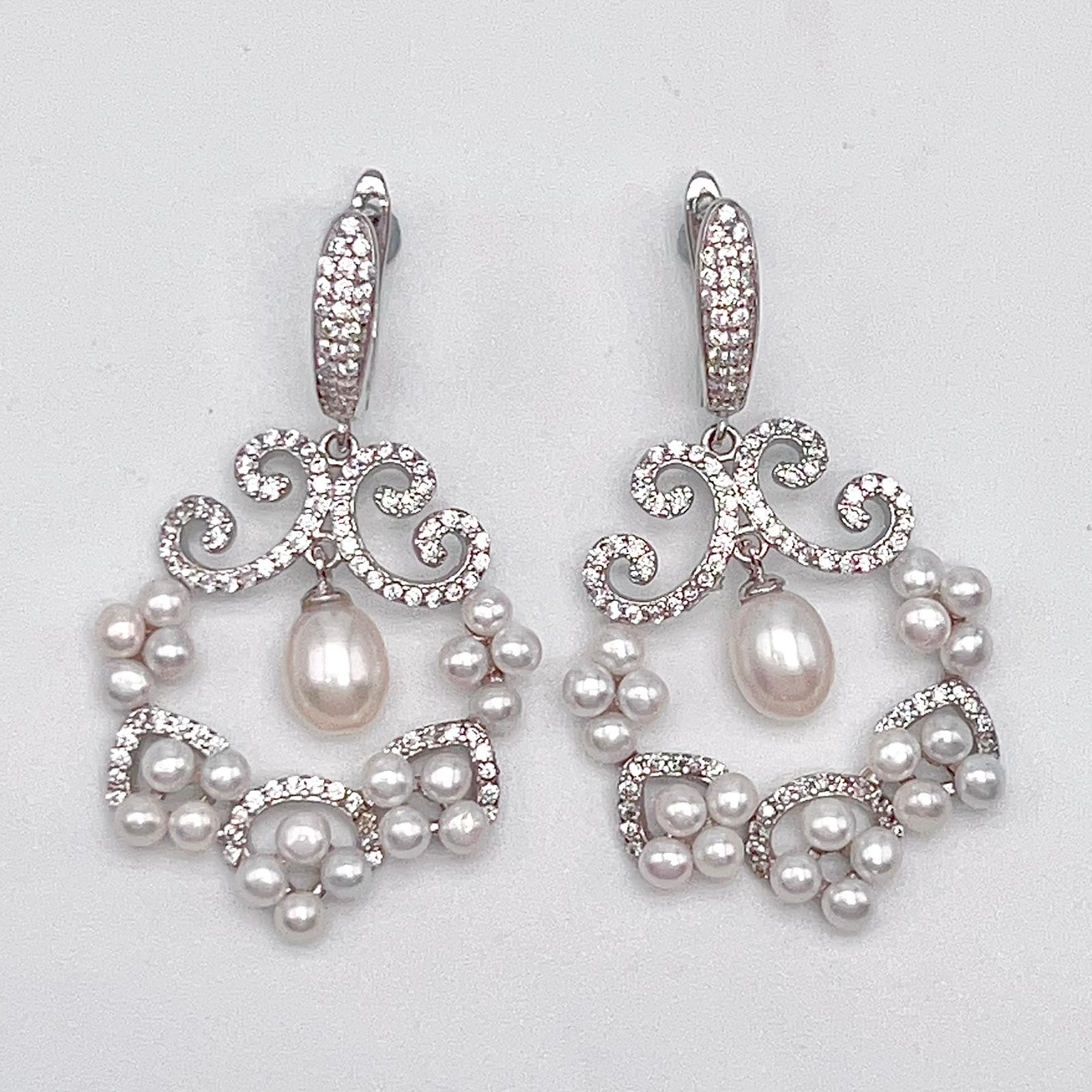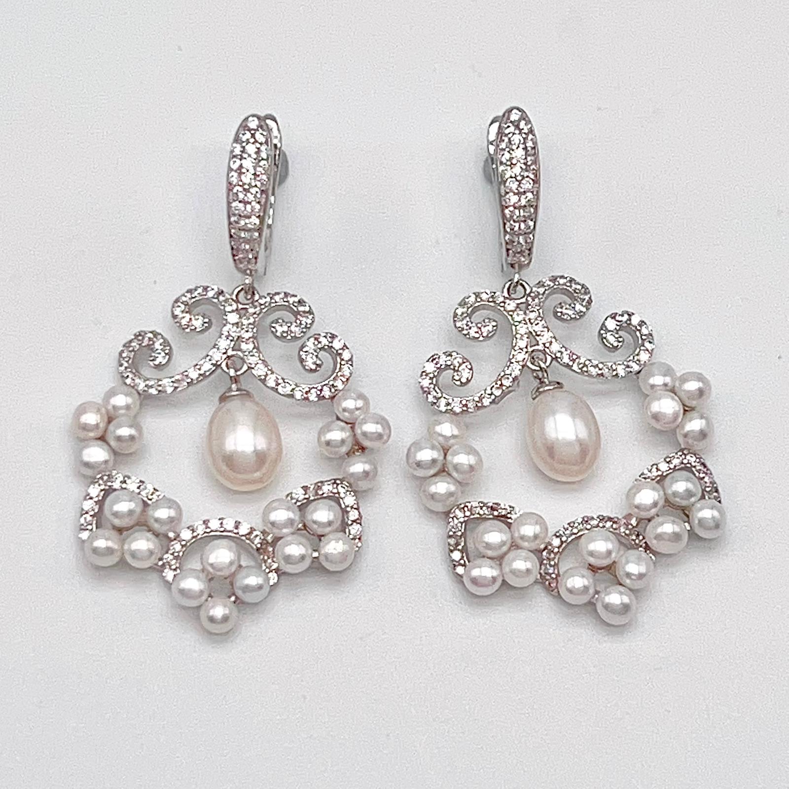 Cultured Pearl Cluster Scroll Dangle Earrings Silver 925