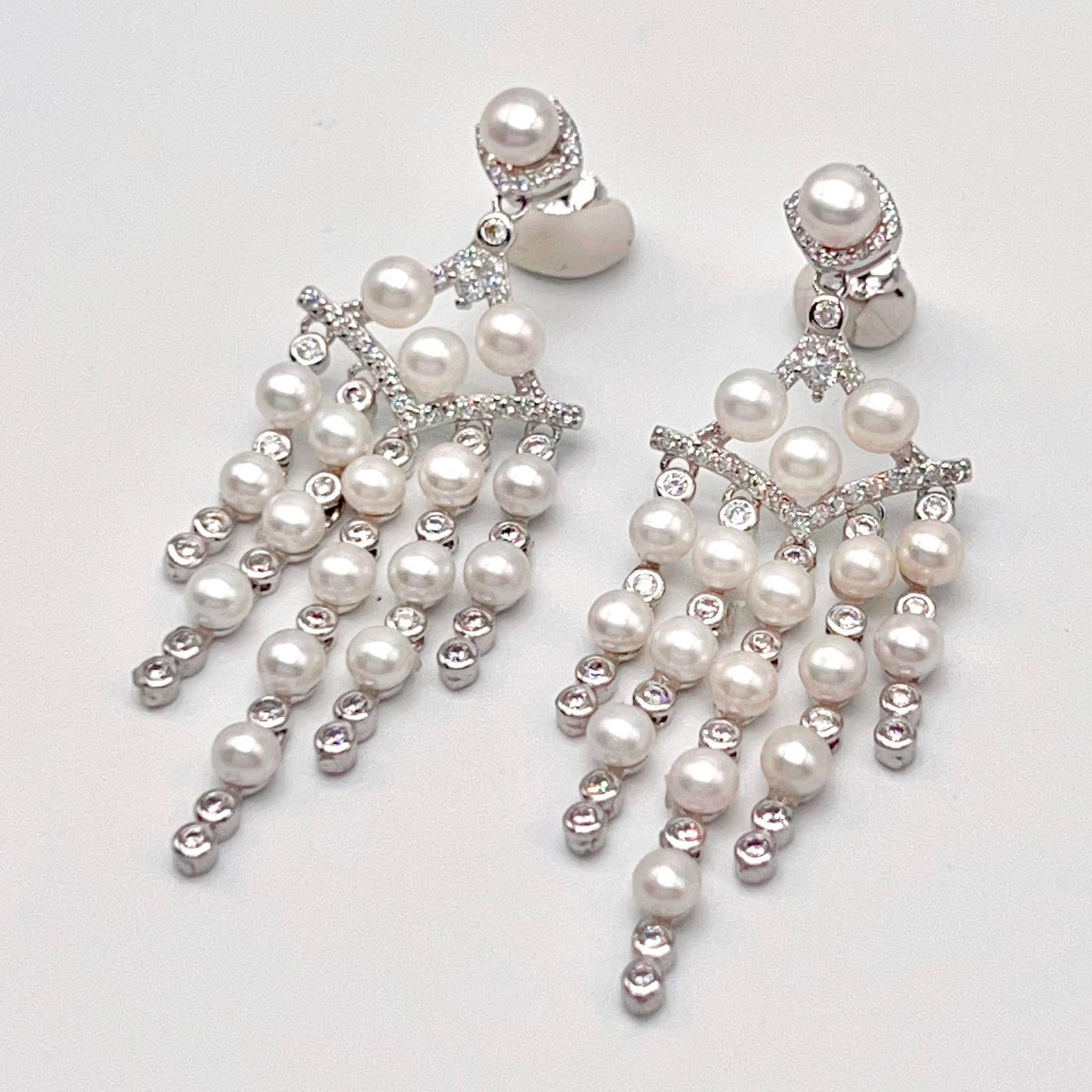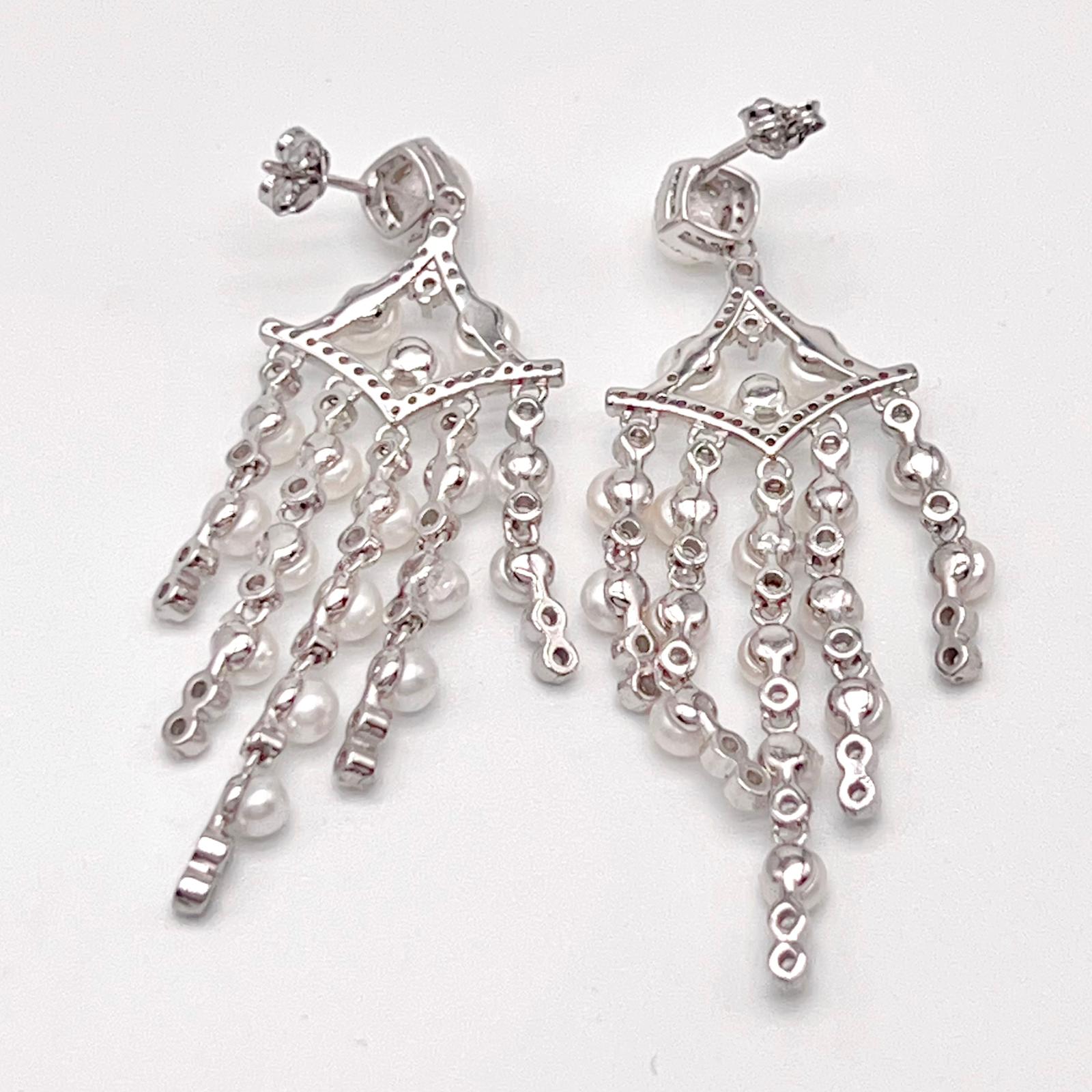 These spectacular Freshwater Pearl chandelier earrings feature multiple strands of lustrous pearls cascading from a sparkling, diamond-accented post and geometric frame.