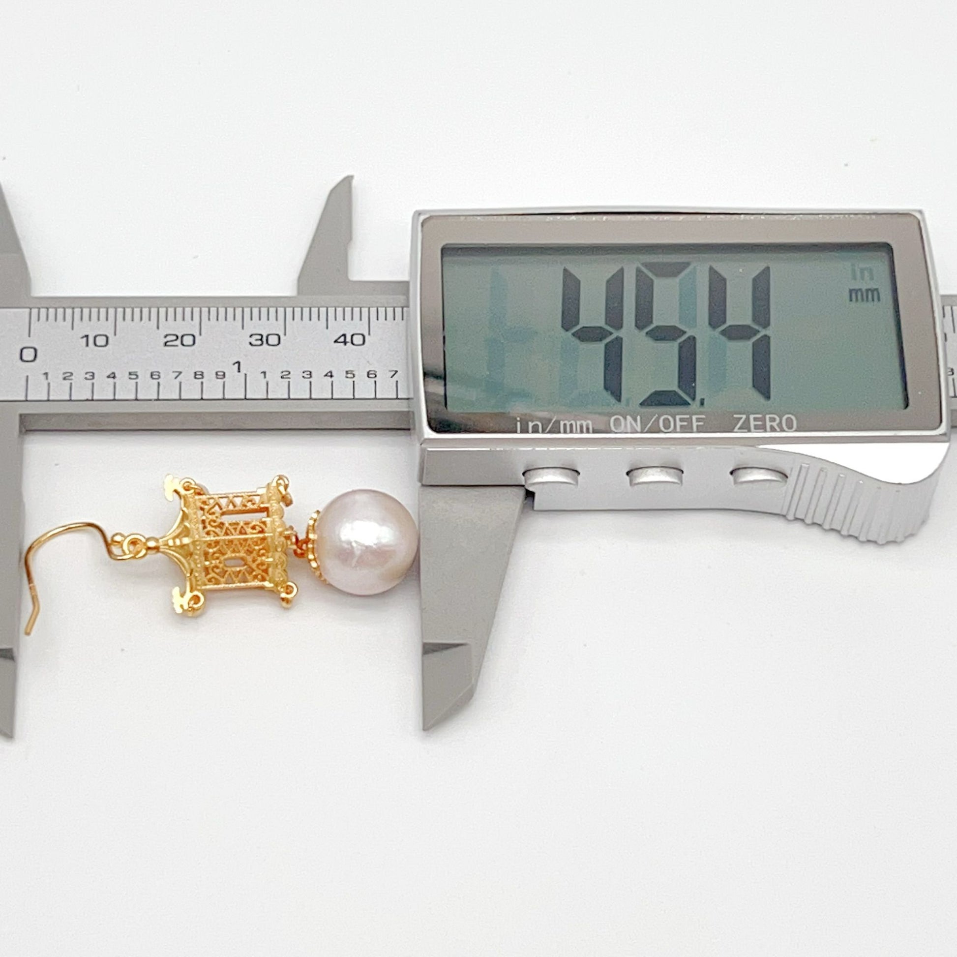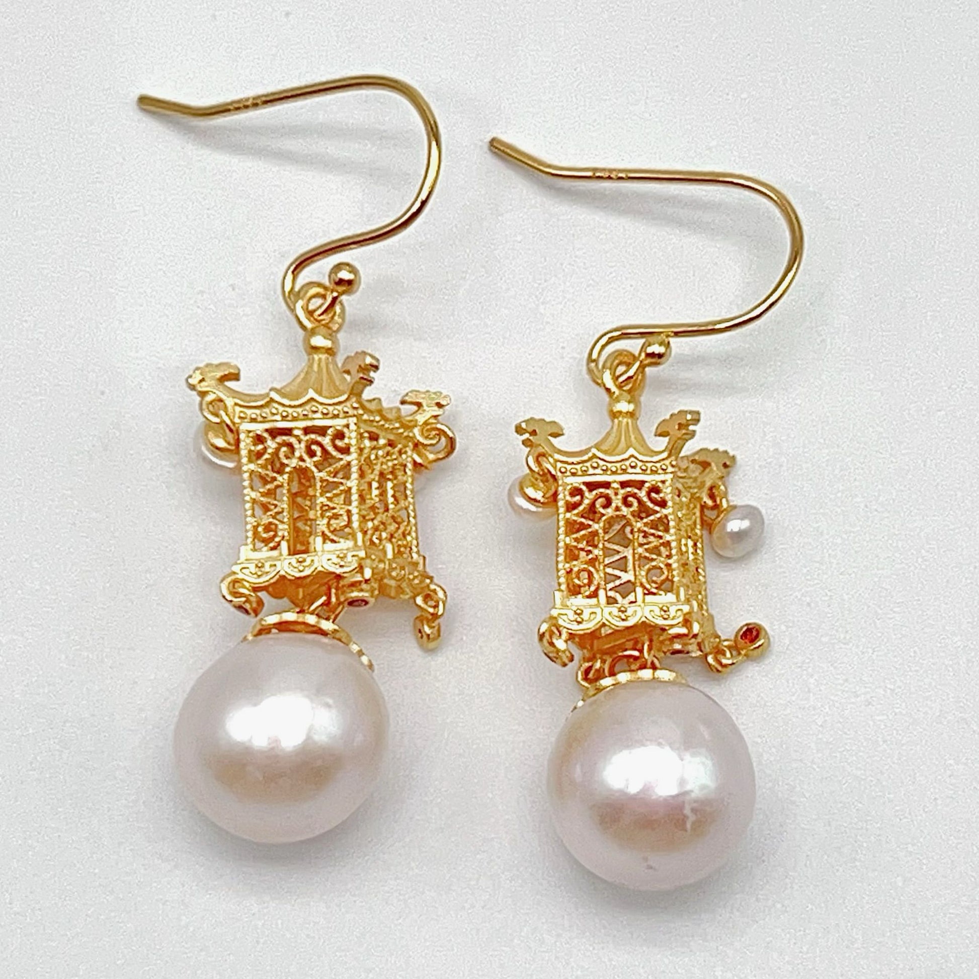 Gorgeous decorative earring in Three Dimensional Craft in Silver 925 of oriental temple shape , hanging 2 natural fresh water pearls , which is a very creative jewelry for daily , event or party occasion and just make you stunning only with simple dressing.