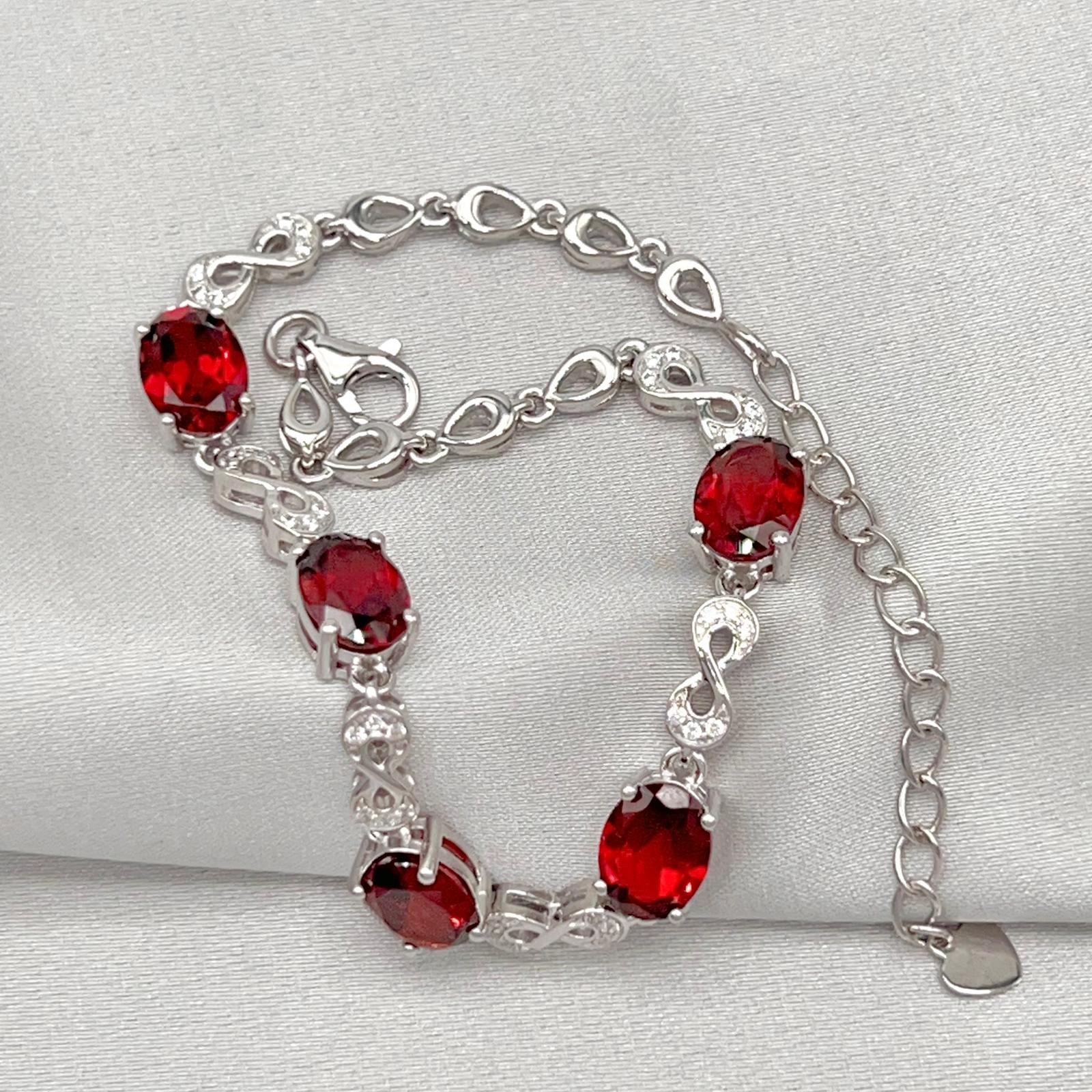 This stunning Garnet Infinity Bracelet 925 features brilliant oval-cut Garnet stones linked by elegant, sparkling infinity symbols. The romantic design is crafted from polished 925 sterling silver and includes an adjustable length.